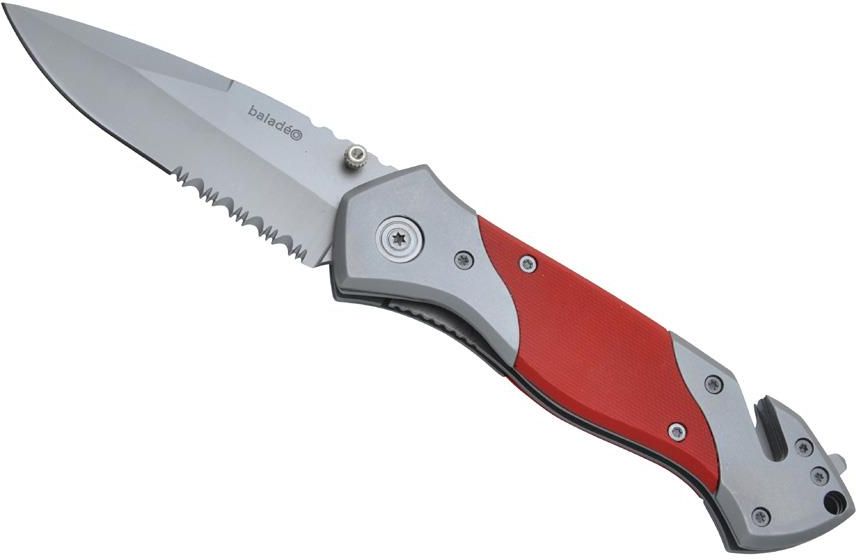 Baladeo Nóż ratowniczy Baladeo Rescue Security Knife - red Niezastąpiony w sytuacjach awaryjnych nóż ratowniczy Baladeo Rescue Security Knife. Masywny nóż, który może pomóc w ratowaniu życia. Szczególnie przydatny w podróży czy na wyprawie, gdzie może dochodzić do wypadków komunikacyjnych. Dość duże wymiary rękojeści sprawiają, że bardzo dobrze leży w dłoni. Solidna konstrukcja powstała w oparciu o stal nierdzewną, która zapewnia długą żywotność noża. Ostrze częściowo wyposażono w ząbki, które ułatwiają przecinanie lin. Zastosowany bolec pozwala na szybkie rozłożenie noża Rescue Security jedną ręką. Automatyczna blokada zapobiega niezaplanowanemu złożeniu ostrza. Z drugiej strony rękojeści umieszczono zbijak do szyb oraz przecinak do pasów, pozwalające błyskawicznie dotrzeć do poszkodowanego i wyciągnąć go z pojazdu. Składany nóż Baladeo Rescue Security Knife to nie tylko narzędzie ratownicze, sprawdzi się równie dobrze podczas przygotowywania posiłków, czy docinania lin w czasie wyprawy trekkingowej. Najważniejsze cechy Ostrze z stali nierdzewnej; Rękojeść to połączenie stali nierdzewnej i trwałego tworzywa G10; Możliwość otwierania jedną ręką; Blokada uniemożliwiająca przypadkowe złożenie ostrza; Przecinak do pasów bezpieczeństwa; Zbijak do szyb; Długość ostrza: 8,5 cm Długość po złożeniu: 12,5 cm