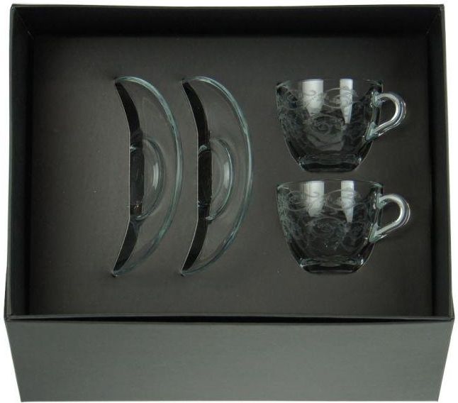 Dekoracja wykonana w naszym zakładzie w Opolu metodą trawienia w szkle. Idealnie nadają sie do mycia w zmywarkach. Filiżanka wykonana jest ze szkła hartowanego, które jest 2-3 razy bardziej odporne na uszkodzenia niż porcelitowe czy porcelanowe produkty o podobnej grubości. Komplet składa się z: 2 x filiżanka 2 x spodek