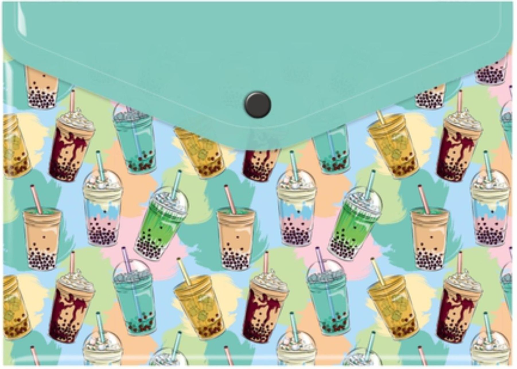 🥤 Teczka kopertowa A5 na zatrzask – wzór bubble tea Funkcjonalna i stylowa teczka kopertowa w formacie A5 to idealne rozwiązanie do przechowywania notatek, dokumentów i wydruków. Wykonana z wytrzymałej, półprzezroczystej folii PP z ozdobnym nadrukiem na całej powierzchni. Bezpieczne zamknięcie – trójkątna klapka z plastikowym napem chroni zawartość przed wypadnięciem 📁 Pojemna – pomieści do 120 kartek w formacie A5 (210x148 mm) 📦 Wytrzymała – grubość folii: 180 mikrometrów (μm) 🎨 Design – kolorowa klapa i pełny, ozdobny nadruk z motywem bubble tea 🥤 Wzór: bubble tea