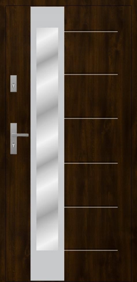 Drzwi zewnętrzne wejściowe Stal PREMIUM + 72 T41 S36 lustro weneckie ciemny orzech 90 cm DRZWI WRAZ Z OŚCIEŻNICĄ KOMPLETNE I GOTOWE DO MONTAŻU Nowoczesne przeszklenie z lustrem weneckim Drzwi PREMIUM o grubości 72 mm Wykonane z stali odpornej na UV Wypełnione pianką poliuretanową dla lepszej termoizolacji Odporne na warunki pogodowe, zniekształcenia, wilgoć ❄️☂️ Wzmocnienia z drewna przy zawiasach i zamkach Spełniają kryteria programu Czyste Powietrze Idealne do domów i mieszkań Wyposażenie i konstrukcja Zamki: 2 trójbolcowe na wkładkę patentową Ościeżnica: stalowo-drewniana Zawiasy: 3D + srebrne osłonki Próg: ciepły Przeszklenie:S36 lustro weneckie Światło przejścia: 90 cm Szerokość: 1011 mm Wysokość: 2080 mm Materiał: stal Masa: 60 kg Kierunek otwierania: lewe Otwieranie: do wewnątrz Grubość: 72 mm Wypełnienie: pianka poliuretanowa