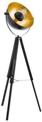 Lampa podłogowa typu tripod COVALEDA. Lampa składa się z trójnożnej podstawy z czarnego drewna o regulowanej wysokości, która połączona jest z dużym, okrągłym, kloszem. Obrotowy klosz wykonany jest ze stali - w kolorze czarnym na zewnątrz, złotym wewnątrz. Półkulista, czarna, metalowa osłona …