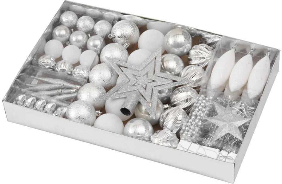 Dekoracje na całą choinkę!Ten zestaw marki Ekvip zawiera opakowanie wypełnione po brzegi praktycznie wszystkim, czego potrzebujesz do ubrania choinki. To idealne rozwiązanie dla wszystkich, którzy chcą kupić pierwsze drzewko lub wymienić wszystkie stare dekoracje na nowe w ładnym, jednolitym stylu. Dekoracje zostały wykonane z tworzywa.Bombki choinkowe w różnych kształtachRóżne warianty klasycznych bombek! Znajdziesz tu duże i małe bombki, a także owalne i podłużne dekoracje w kolorach białym i srebrnym. Sznurek do bombek w zestawie.Gwiazda na czubek, brokat i girlanda perłowaZestaw zawiera także brokat, girlandę perłową, niewielkie prezenty i gwiazdki do ozdoby. Całości dopełnia oczywiście połyskująca gwiazda na czubek!
