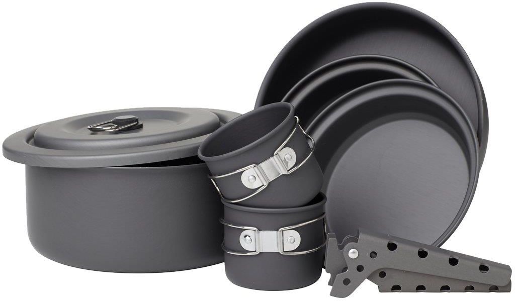 Zestaw naczyń kuchennych do przygód na łonie natury!Ten kompletny zestaw naczyń kuchennych zawiera wszystkie naczynia potrzebne do przyrządzania i spożywania jedzenia: garnek o pojemności 1,7 l, pokrywkę do garnka, patelnię o średnicy 19 cm, rączkę, dwa talerze o średnicy 14 cm i dwa kubki ze składanymi uchwytami.Z mocno anodyzowanego aluminiumWszystkie części są wykonane z twardo anodowanego aluminium i mieszczą się w garnku. Dzięki temu zestaw jest niezwykle lekki (łączna masa to zaledwie 784 g) i łatwo go ze sobą zabrać. Specyfikacja techniczna Gwarancja (w miesiącach): 12 m.