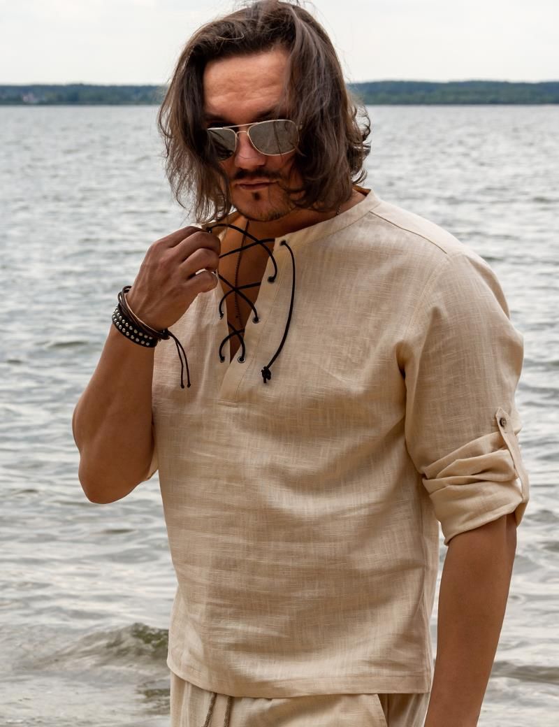 Męska lniana koszula ze skórzanym sznurkiem – naturalna elegancja, wolność i komfort Wyobraź sobie: letni poranek, lekki wietrzyk i delikatne ciepło słońca. Spacerujesz po nadbrzeżu, siedzisz przy ognisku na festiwalu lub pracujesz w kreatywnym studiu. Twoje ubranie to część Twojego nastroju. A ta …
