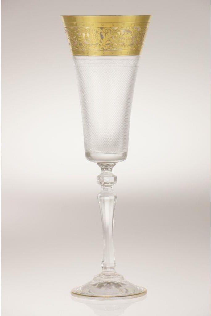Kieliszki do szampana 180ml h-222mm, śr-73mm Dekor wyzłocony ręcznie złotem błyszczącym 24-karatowym Delikatna siateczka trawiona w szkle metodą pantografu. Dekoracja wykonana w całości w naszym zakładzie w Opolu. Szkło mechanicznie dmuchane na Słowacji. Cena za 6 szt brutto