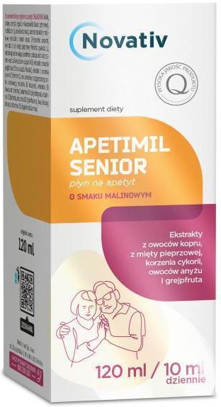 Nazwa produktu Novativ Apetimil Senior, 120 ml Rodzaj produktu suplement diety Opis produktu Ekstrakt z owoców kopru wzmacnia apetyt, wspomaga proces trawienia, ekstrakt z miety pieprzowej ma korzystny wpływ na trawienie i właściwe funkcjonowanie przewodu pokarmowego, ekstrakt z korzenia cykorii …