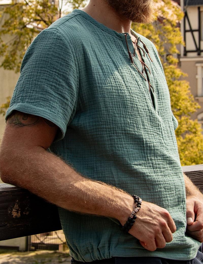 Inspirowana stylem średniowiecznym i skandynawskim koszulka męska jest idealna do stworzenia autentycznego wyglądu na festiwalach lub targach. W takiej koszulce przyciągniesz uwagę. Ten element garderoby doskonale łączy w sobie prostotę i wygodę. Ten styl koszulek można zobaczyć w różnych filmach i serialach, takich jak Gra o Tron, Władca Pierścieni, Wiedźmin. Dekolt ma kształt litery „V” z wiązaniami. Miękki i lekki muślin jest wysoce oddychający, dzięki czemu jest wygodny w każdej sytuacji. Koszula z muślinu bawełnianego Kolor na zdjęciu Sage green Krótki rękaw Dekolt w kształcie litery V ozdobiony sznurkiem Luźny krój Ozdobny kołnierzyk Tkanina antyalergiczna Styl rustykalny, styl wikingów, styl średniowieczny, styl skandynawski Na zdjęciu pokazana koszula w rozmiarze L. Modelka nosi rozmiar M - L. *Podane wymiary mogą mieć błąd około +-1 cm Skład: 100% bawełna --------------- Uwaga! W tabeli rozmiarów podane są wymiary ciała, a nie wymiary produktu. Przed zakupem zdecydowanie zalecamy zmierzenie swoich wymiarów, np. zmierzyć obwód klatki piersiowej i dodać około 14 cm na "swobodne dopasowanie". (Zawsze dodajemy około 14 cm) Na przykład, jeśli masz obwód klatki piersiowej = 100 cm (w tabeli jest to rozmiar L), otrzymasz koszulę o obwodzie klatki piersiowej 114 cm. Jeśli uważasz, że koszula będzie zbyt luźna, zalecamy zamówienie mniejszego rozmiaru. Z muślinu szyje się tylko luźne ubrania. --------------- Wszystkie nasze produkty szyjemy sami i korzystamy z materiałów dostępnych na lokalnym rynku :) LARIKO Studio - to polska rodzinna firma, tworząca rzeczy, które dają się zakochać. Produkujemy wszystkie rzeczy z dbałością o każdy detal.