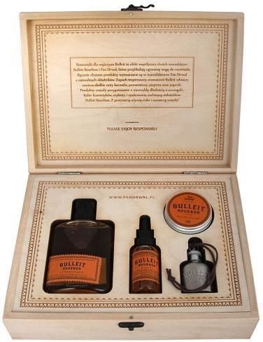 Zestaw do pielęgnacji brody BULLEIT Pan Drwal Zestaw Bulleit Beard Kit od Pana Drwala. Zestaw jest zapakowany w skrzynkę drewnianą o wymiarach 28 x 20 x 8 cm. Kosmetyki wewnątrz są zabezpieczone wypełnieniem z pianki oraz sklejki. Skrzynka posiada grawer w klimacie Bulleit, a w środku aftershave, olejek i balsam do brody oraz metalowy bojlerek Bulleit (tym razem pusty). Górna pokrywa zamykana magnetycznie oraz na zasuwę. Zestaw to moc solidnej, rzemieślniczej pracy. Z pewnością zadowoli najbardziej wymagających graczy!