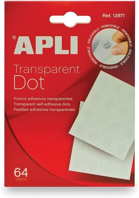 Kółka mocujące APLI - transparentne i usuwalne Prezentujemy praktyczne 64 sztuki kółek mocujących transparentnych typu dot produkcji APLI, które są idealnym rozwiązaniem dla osób poszukujących wygodnego sposobu przymocowania różnorodnych notatek czy próbek do czasopism. Dzięki uniwersalności zastosowania, kółka te sprawdzą się zarówno w biurze, jak i w domu.Specjalna perforacja zapewnia łatwość odrywania poszczególnych elementów, co pozwala na wygodne i szybkie korzystanie z produktu. Ponadto, innowacyjny, bezdotykowy sposób aplikacji minimalizuje ryzyko uszkodzenia notatek oraz zanieczyszczenia klejem.Kółka mocujące są wykonane z transparentnego kleju "hotmelt", co sprawia, że są one praktycznie niewidoczne na powierzchni, a jednocześnie skutecznie spełniają swoją funkcję. Możliwość usuwania kółek pozwala na wygodne modyfikowanie wyklejanych materiałów, bez obawy o ich trwałe zniszczenie.W ofercie znajdują się kółka w kolorze transparentnym, dzięki czemu pasują do każdego rodzaju notatek czy próbek. Wybierz kółka mocujące APLI i ciesz się wygodą i funkcjonalnością tego produktu. EAN: 8410782128717