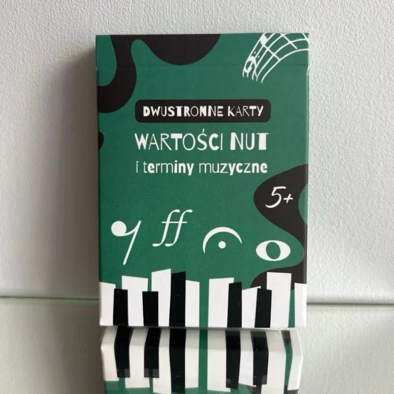 SILESIA DRUM Wartości nut i terminy muzyczne - dwustronne karty (fiszki) Jak pomóc dziecku utrwalić wartości nut i terminy muzyczne? Można wspomóc się grami, które uprzyjemnią naukę na początkowych etapach edukacji muzycznej! Nasze dwustronne karty pozwalają na wykorzystanie ich na wiele różnych sposobów. Mogą być fiszkami, zadaniami do wykonania przy fortepianie, kartami do podzielenia na grupy. Wykorzystasz je zarówno w domu, jak w klasie, na lekcji. Na kartach znajdziesz takie elementy dzieła muzycznego: rytmika – wartości nut i pauz (np. cała nuta, półnuta), artykulacja (np. staccato, legato), dynamika (np. forte, piano). W tekturowym pudełku znajdziesz 25 dwustronnych karty. Na stronie z zieloną ramką jest nazwa jakiegoś terminu muzycznego, na stronie z brązową ramką jest jego symbol. Zaproś do zabawy dzieci powyżej 5 roku życia, które zaczynają naukę gry na instrumencie. Wartości nut i terminy muzyczne – dwustronne karty to wsparcie dla nauczycieli, rodziców i dzieci.