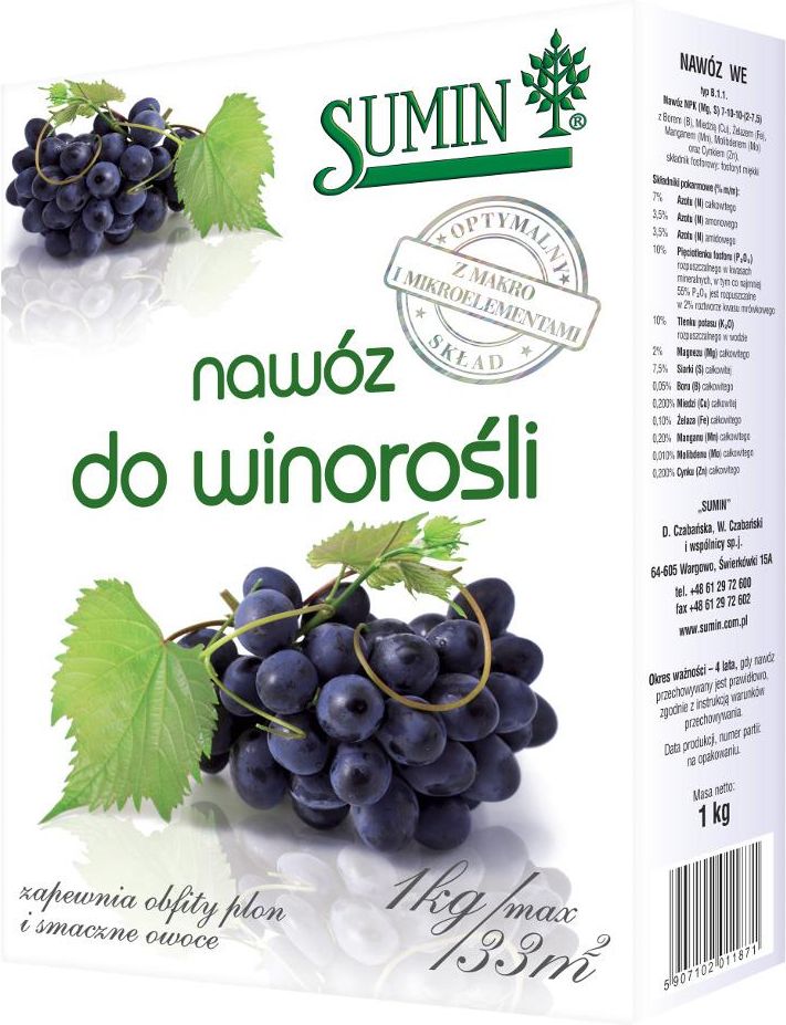 SUMIN NAWÓZ DO WINOROŚLI 1 kg OPTYMALNY SKŁAD Sumin do Winorośli 1 kgNawóz do winorośli - odpowiednio dobrane formy azotu, fosforu oraz szybko przyswajalny magnez decydują o prawidłowym, rozłożonym w czasie działaniu nawozu i skutecznym pobieraniu składników pokarmowych przez rośliny. Przewaga fosforu i potasu w stosunku do azotu zawartego w nawozie umożliwia obfite kwitnienie i owocowanie roślin oraz wysoką jakość konsumpcyjną winogron. Każda granulka zawiera deklarowane składniki pokarmowe. Zapewnia to ich równomierne rozmieszczenie na powierzchni gleby. Zawiera: Azot (N), Fosfor (P), Potas (K), Magnez (Mg), Siarkę (S), Bor (B), Miedź (Cu), Żelazo (Fe), Mangan (Mn), Molibden (Mo), Cynk (Zn). Zapraszamy do zakupów! 5907102011871 017035