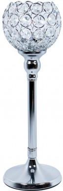 ŚWIECZNIK OKRĄGŁY 40/12/12 srebrny Świecznik z kryształami to ozdobny element wystroju wnętrza. Świecznik ma okrągły kształt i został wykonany z srebrnej metalowej ramy ozdobionej kryształami. Jego wysokość wynosi 39cm, co czyni go dość dużym elementem dekoracyjnym. Może być wykorzystywany do udekorowania różnych pomieszczeń, takich jak salon, jadalnia czy sypialnia. Ze względu na swoją elegancką formę, świetnie pasuje do różnych stylów aranżacji wnętrz, w tym do nowoczesnych, klasycznych oraz glamour.