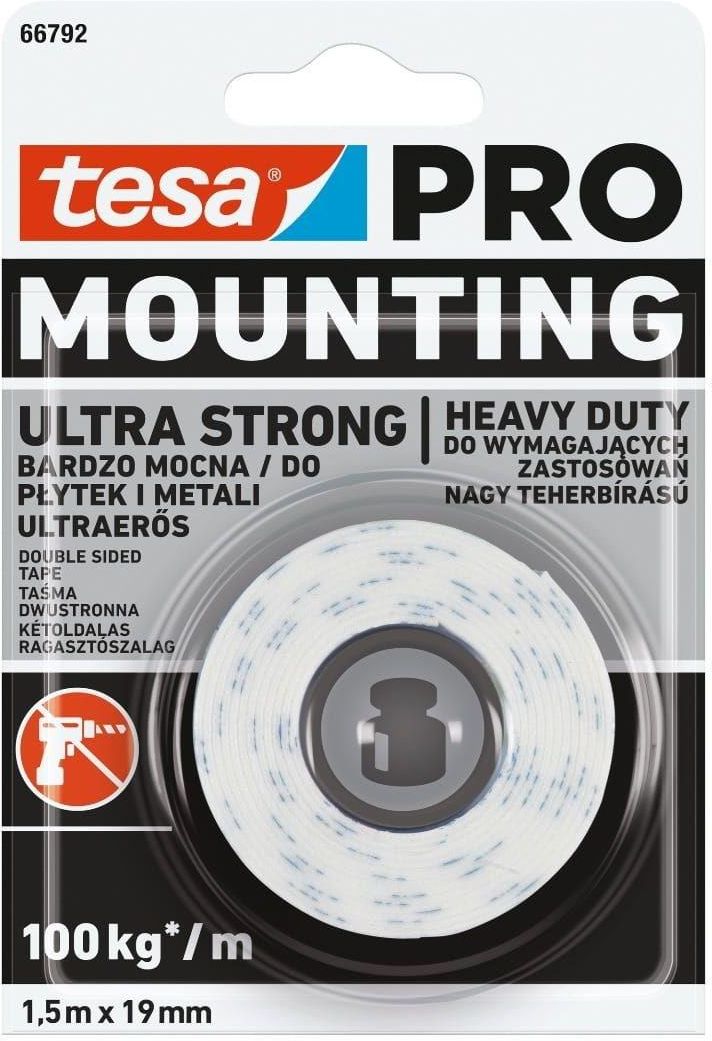 Dwustronna taśma montażowa tesa® PRO Mounting Ultra Strong 1,5m x 19mm Ta najmocniejsza z taśm montażowych nadaje się do mocowania przedmiotów w sposób zarówno niezawodny, jak i trwały. Pasek taśmy tesa PRO Mounting Ultra Strong o długości 10 cm jest w stanie utrzymać ciężar do 10 kg, a także wyrównuje niewielkie nierówności powierzchni mocowania. Do zastosowań wewnątrz i na zewnątrz pomieszczeń: Nadzwyczajnie mocna masa klejąca sprawdza się na powierzchni z płytek, wykończonego drewna i większości tworzyw sztucznych oraz idealnie nadaje się do mocowania znaków, profili i im podobnych. Główne cechy Najlepsze rozwiązanie do mocowania ciężkich przedmiotów: pasek tej najmocniejszej dwustronnej taśmy tesa, o długości 10 cm utrzyma ciężar do 10 kg – łatwe mocowanie, natychmiastowe działanie Niezawodne mocowanie bez wiercenia dziur: dzięki taśmie tesa PRO Mounting Ultra Strong korzystanie ze śrub, wkrętów lub gwoździ to już historia – szybkie i łatwe mocowanie bez użycia narzędzi Do zastosowań wewnątrz i na zewnątrz pomieszczeń Idealnie sprawdza się na powierzchniach z płytek, drewna, kamienia i większości tworzyw sztucznych, a nawet wyrównuje niewielkie nierówności powierzchni mocowania – idealnie nadaje się do mocowania znaków, profili, elementów dekoracyjnych, skrytek na klucze i im podobnych Łatwość użycia: Taśmę montażową można ciąć, w zależności od potrzeb, na mniejsze lub większe kawałki, tak aby uzyskać paski samoprzylepne o optymalnych rozmiarach