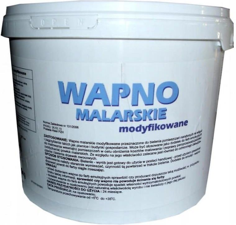 Wapno Malarskie modyfikowane 12kg Wapno malarskie modyfikowane przeznaczone do bielenia pomieszczeń narażonych na wilgoć i zagrzybienie takich jak piwnice i budynki gospodarcze. Może być stosowany jako dodatek do farb emulsyjnych do malowania wewnątrz pomieszczeń w celu obniżenia kosztów malowania i poprawy paroprzepuszczalności (oddychania) powłok malarskich. Ze względu na jego właściwości zalecane jest również do ochronnego zabezpieczania i bielenia drzewek owocowych. Sposób Stosowania Bielenie - wyrób jest gotowy do użycia w spostaci handlowej (produkt jest gęsty) -przed użyciem zawartość opakowania należy starannie wymieszać , czynność tą powtarzać w trakcie bielenia.Dodatek do emulsji - wapno dozować powoli do farby ciągle mieszając. UWAGA! Przed dodanie wapna do farb emulsyjnych sprawdzić czy producent dopuszcza taką możliwość , w przypadku braku takiej informacji sprawdzić czy wapno nie powoduje ściniania sie farby. dodatek do farb emulsyjnych powoduje spadek własności wytrzymałościowych powłoki. rozwarstwienie w opakowaniu jest naturalną właściwością wyrobu i nie świadczy o jego złej jakości. Wydajność Informacja przesłana przez Główny Specjalista ds. Aplikacji i Szkoleń Śnieżka SA Niestety nie jest możliwe podanie wydajności wapna. Każdy wg uznania dodaje do niego wody, bywa że nawet 50%. Konsystencja wyrobu wpływa na jego wydajność, produkt rzadki nakłada się cienką warstwą i na odwrót. Zapis na opakowaniu mówiący o wydajności produktu byłby nieprofesjonalny i niewiele mówił. WAGA 1SZT Z OPAKOWANIEM DO WYSYŁKI = około 14Kg
