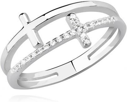Bardzo delikatny pierścionek z wysokiej jakości srebra próby 925, który ozdobiony został dwoma krzyżykami, z których jeden pokryty jest jasnymi cyrkoniami. Stanowi on doskonały wybór na prezent dla wyjątkowej osoby. Jest to pełen blasku akcent biżuteryjny, który będzie stanowić niezwykle elegancką ozdobę każdej kobiecej dłoni. Szerokość pierścionka: 10,5 mm Kolor: Srebrny Materiał: Srebro próby 925 Powłoka: Rodowanie Waga: 2,3g
