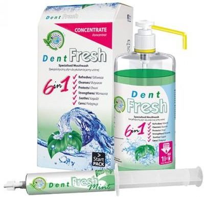 Specjalistyczny płyn do płukania jamy ustnej z naturalnymi olejkami eterycznymi. Płukanka Dent Fresh to jedyny na rynku koncentrat specjalistycznego płynu do płukania jamy ustnej. Łączy w sobie zalety profesjonalnych płukanek, wyróżniając się 10-krotnie większą wydajnością. Dent Fresh pomaga usuwać zanieczyszczenia powstałe w trakcie zabiegu oraz łagodzi podrażnienia. Nie zawiera cukru. Formuła zawiera dużą ilość naturalnych olejków eterycznych, gwarantujących uczucie chłodu oraz przyjemny miętowy zapach. Skład: aqua, alcohol, polysorbate 20, propylene glycol, PEG – 40 hydrogenated castor oil, potassium acesulfame, menthol, methyl salicylate, sodium benzoate, olaflur, eucalyptol, thymol, CI 47005, CI 42051 odświeża Odświeża oddech, nadaje uczucie chłodu i świeżości w jamie ustnej oczyszcza Usuwa resztki jedzenia, zapobiega powstawaniu płytki nazębnej chroni Chroni zęby przed próchnicą wzmacnia Wzmacnia szkliwo zębów łagodzi Łagodzi podrażnienia w jamie ustnej pielęgnuje Pomaga zachować zdrowe zęby i dziąsła ZASTOSOWANIE: Płukanka Dent Fresh to jedyny na rynku koncentrat specjalistycznego płynu do płukania jamy ustnej. Łączy w sobie zalety profesjonalnych płukanek, wyróżniając się 10-krotnie większą wydajnością. Dent Fresh pomaga usuwać zanieczyszczenia powstałe w trakcie zabiegu oraz łagodzi podrażnienia. Nie zawiera cukru. DOSTĘPNE OPAKOWANIE: - Start Pack koncentrat w strzykawce 50 ml + butelka 1 l z dozownikiem SPOSÓB PRZYGOTOWANIA: 1. Wlej zawartość strzykawki do butelki o pojemności 1 litra. 2. Uzupełnić butelkę wodą do pełna. 3. Dokładnie wymieszaj zawartość butelki. 4. Nakręć dozownik dołączony do zestawu na butelkę. 5. Wlej dwie pełne dozy płynu do kubka. 6. Dodaj 100 ml wody.
