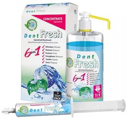 Specjalistyczny płyn do płukania jamy ustnej z chlorheksydyną Zawiera specjalną kompozycję aktywnych składników, które działają antybakteryjnie oraz pomagają zwalczać płytkę nazębną. Skład: alcohol, aqua, polysorbate 20, PEG-40 hydrogenated castor oil, propylene glycol, methyl salicylate, potassium acesulfame, menthol, chlorhexidine digluconate, olaflur, eucalyptol, thymol, CI 42051 odświeża Odświeża oddech, nadaje uczucie chłodu i świeżości w jamie ustnej oczyszcza Usuwa resztki jedzenia, zapobiega powstawaniu płytki nazębnej chroni Chroni zęby przed próchnicą wzmacnia Wzmacnia szkliwo zębów łagodzi Łagodzi podrażnienia w jamie ustnej pielęgnuje Pomaga zachować zdrowe zęby i dziąsła ZASTOSOWANIE: Płukanka Dent Fresh to jedyny na rynku koncentrat specjalistycznego płynu do płukania jamy ustnej. Łączy w sobie zalety profesjonalnych płukanek, wyróżniając się 10-krotnie większą wydajnością. Dent Fresh pomaga usuwać zanieczyszczenia powstałe w trakcie zabiegu oraz łagodzi podrażnienia. Nie zawiera cukru. DOSTĘPNE OPAKOWANIE: - Start Pack koncentrat w strzykawce 50 ml + butelka 1 l z dozownikiem SPOSÓB PRZYGOTOWANIA: 1. Wlej zawartość strzykawki do butelki o pojemności 1 litra. 2. Uzupełnić butelkę wodą do pełna. 3. Dokładnie wymieszaj zawartość butelki. 4. Nakręć dozownik dołączony do zestawu na butelkę. 5. Wlej dwie pełne dozy płynu do kubka. 6. Dodaj 100 ml wody.