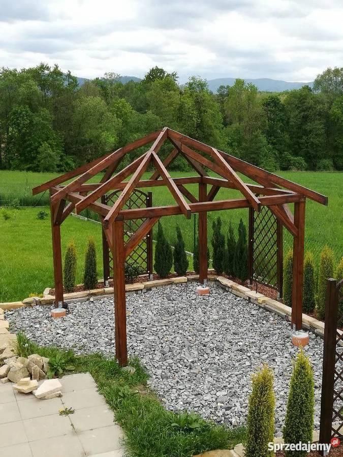 oferujemy w sprzedazy konstrukcje altany do samodzielnego montazu konstrukcja wykonana jest na podwalinie gr 11,5cmx11,5 krokwie 5,5x11.5cm konstrukcja ta wykonywana jest pod konkretny wymiar kupujacy musi sobie we własnym zakresie zabetonować kotwy najlepiej regulowane a my dopasujemy wymiar do …