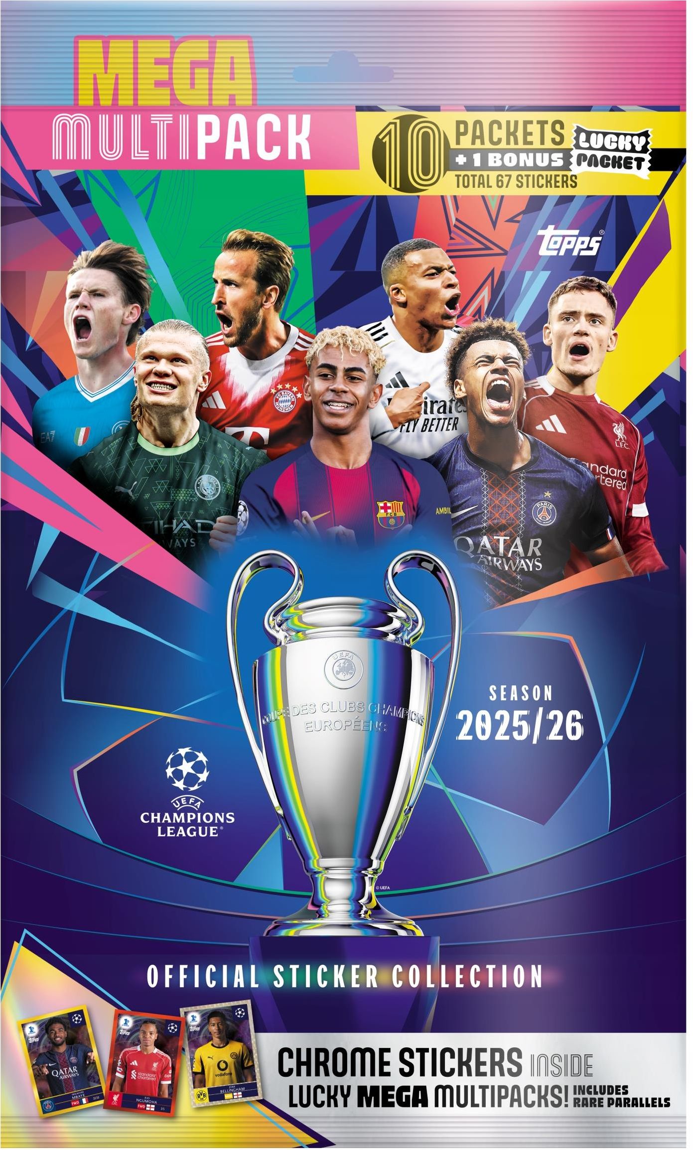NAKLEJKI PIŁKARSKIE CHAMPIONS LEAGUE 2026 TOPPS MEGA MULTIPACK CHAMPIONS LEAGUE 2025/26 KOLEKCJA NAKLEJKOWA-MEGA MULTIPACK Zawartość mega multipacka 10 saszetek z naklejkami ( 6 w każdej = 60) 1 bonus lucky packet ( 7 naklejek) W MEGA MULTIPACKU znajdziesz naklejki CHROME w tym RARE PARALLELS RAZEM …