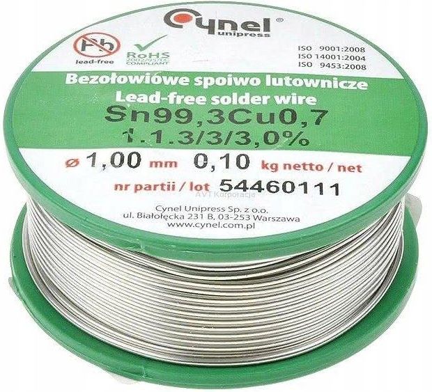 CYNA BEZOŁOWIOWA POLSKIEJ PRODUKCJI CYNEL Szpula 100g Średnica 1mm SN99,3Cu0,3 Najefektywniejsza alternatywa dla spoiw ołowiowych, do użytku profesjonalnego i amatorskiego. Oznaczenie stopu zgodnie z normą ISO 9453:2014: Sn99,3Cu0,7 (401) Postać produktu: drut z topnikiem Nazwa topnika: SW26 1. Charakterystyka ogólna Bezołowiowy stop lutowniczy Sn99,3Cu0,7 jest produkowany przez firmę Cynel-Unipress w pierwszym wytopie cyny i miedzi. Jego skład chemiczny jest zgodny z normą ISO 9453:2014. Stop Sn99,3Cu0,7 jest najefektywniejszą kosztowo alternatywą dla stopów lutowniczych zawierających ołów. Nie zawiera srebra. Stop przeznaczony jest do lutowania w technologii bezołowiowej. Spełnia wymagania dyrektywy RoHS. Może być sprzedawany na rynku konsumenckim i używany również przez osoby prywatne poza zastosowaniami profesjonalnymi. 2. Skład stopu [%] Sn: reszta Cu: 0,5 - 0,9 Bi: 0,1 Sb: 0,1 Ag: 0,1 Cd: 0,002 Au: 0,05 In: 0,1 Pb: 0,07 Al: 0,001 As: 0,03 Fe: 0,02 Ni: 0,01 Zn: 0,001 inne: - 3. Charakterystyka fizyczna Temperatura topnienia (solidus/liquidus): 227°C (stop eutektyczny) Ciężar właściwy: 7,31 g/cm3 Rezystywność: 0,126 μΩ•m Przewodność cieplna: 66 W/m•K Wytrzymałość na rozciąganie przy zerwaniu: 300 kg/cm2 Wydłużenie przy zerwaniu: 21% Twardość: 9 HB Zalecana temperatura grota przy lutowaniu: 320 - 360°C (dla elementów niklowanych do 400 °C) 4. Topnik SW26 Topnik halogenkowy na bazie zmodyfikowanej kalafonii. Zapewnia bardzo dobrą lutowność w popularnych zastosowaniach we wszystkich gałęziach przemysłu, a także w zastosowaniach hobbystycznych. Topnik działa na większości powierzchni metalowych z wyjątkiem aluminium, jego stopów i stali nierdzewnej. Pozostałości topnika po lutowaniu nie muszą być usuwane i mogą pozostać na lutowanej powierzchni. Do zmywania pozostałości zalecane są rozpuszczalniki na bazie alkoholu.