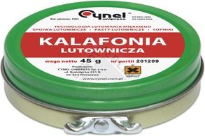 Kalafonia 60412 CYNEL Zastosowanie: ułatwienie lutowania, zapobiega powstawaniu tlenków podczas lutowania Kod PKWiU: 20.59.56.0 Kod EAN: 5903755604125