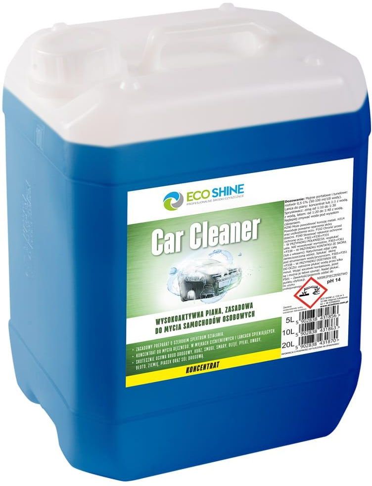 PROFESJONALNA CHEMIA DLA CIEBIE I TWOJEJ FIRMY... PROFESJONALNY specjalistyczny preparat marki ECO SHINE CAR CLEANER op. 10 L Wysokoaktywna piana, lekko zasadowa do mycia samochodów osobowych. Mocno pieniąca. Zapach owocowy. KONCENTRAT. Nowa ulepszona receptura. Obniżono odczyn z pH 14 do pH 12 dzięki wyeliminowaniu żrących dla skóry, lakieru, felg i części samochodowych alkaliów, jednocześnie zwiększono siłę odklejania brudu poprzez zastosowanie najnowszych skuteczniejszych składników aktywnych. pH 1% roztworu to zaledwie pH 9 (praktycznie neutralne-lekko zasadowe) Właściwości: Efekt bardzo mocnego spieniania. Efektywny system odklejania brudu. Doskonałe działanie w zimnej i ciepłej wodzie, w każdej temperaturze otoczenia. Szerokie spektrum działania. Synergiczny system usuwający letnie i zimowe zabrudzenia. Skutecznie usuwa brud drogowy, kurz, smugi, smary, oleje, pyłki, owady, błoto, ziemię, piasek oraz sól drogową. Zapach owocowy. Zastosowanie: mycie ręczne mycie mechaniczne myjki ciśnieniowe lance spieniające myjnie tunelowe Sposób użycia i dozowania: Myjnie portalowe i tunelowe: roztwór 0,5-1% (50-100 ml/10l wody). Lanca do piany: koncentrat lub 1:5 z wodą. Spryskiwacz: zimą od 1:10 do 1:30 z wodą, latem: od 1:20 do 1:40 z wodą. Najlepiej zmywać woda pod wysokim ciśnieniem. Bezpieczeństwo stosowania: Unikać kontaktu z oczami Stosować rękawice ochronne. Dane techniczne: Termin trwałości: 24 miesiące. Gęstość: 1,1 g/ml. pH koncentratu: 12,0, pH 5% roztworu: 10,1, pH 1% roztworu: 9,0 Dostępna Karta Charakterystyki produktu. SERDECZNIE POLECAM PRODUKT PROFESJONALNY SPRAWDZONY I SKUTECZNY Preparat daje stabilną pianę przy nanoszeniu lancą pianotwórczą. Praca z tym płynem jest naprawdę "przyjemna" ze względu na ładny zapach środka. Gorąco polecam.