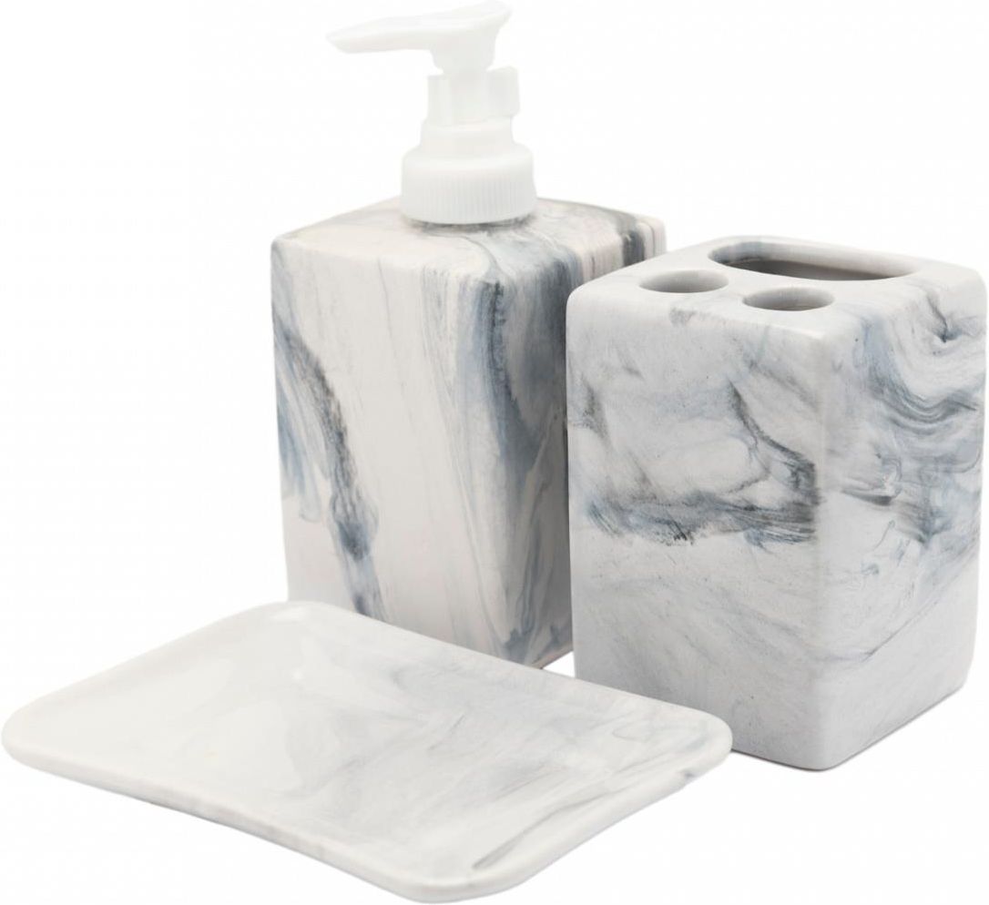Ceramiczny zestaw łazienkowy o kwadratowym kształcie. Biały zestaw imitujący wzór marmuru z białymi dodatkami wykonanymi z tworzywa sztucznego. Komplet składa się z mydelniczki, dozownika do mydła o pojemności około 460 ml i kubka. Stylowy zestaw idealnie wpasuje się do każdej łazienki i doda jej …