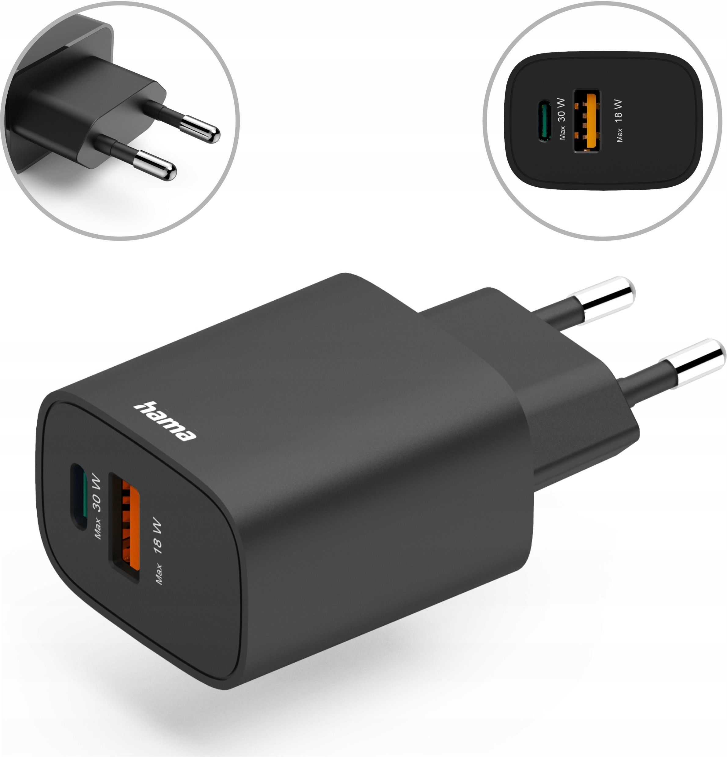 2019600000 HAMA ŁADOWARKA 30W ENTRY LEVEL, 1X USB-C 1X USB-A, CZARNA Szybkość i bezpieczeństwo w jednym – Hama ładowarka USB-A/USB-C Funkcjonalność Szybkie ładowanie urządzeń – do 60% w zaledwie 30 minut Technologia Power Delivery i Qualcomm® 2.0 dla maksymalnej wydajności Dwa porty – USB-C i USB-A – do jednoczesnego ładowania różnych urządzeń Kompatybilna ze smartfonami, tabletami, powerbankami i AirPods Obsługuje iPhone’y od serii 11 do 16 oraz modele SE System zabezpieczeń przed przegrzaniem, przepięciem i przeciążeniem Inteligentne rozpoznawanie urządzenia i optymalne dostosowanie mocy Proces ładowania przyjazny baterii – wydłużona trwałość akumulatora Moc i efektywność Hama ładowarka oferuje szybkie ładowanie urządzeń mobilnych, umożliwiając osiągnięcie nawet około 60% naładowania w pół godziny. To idealne rozwiązanie dla osób korzystających z telefonów o dużej mocy ładowania lub urządzeń pozbawionych zasilacza w zestawie. Technologia Power Delivery Zastosowana technologia Power Delivery w połączeniu z Qualcomm® 2.0 gwarantuje dynamiczne dopasowanie mocy ładowania. Dzięki temu każde urządzenie – od smartfona po tablet – otrzymuje optymalne zasilanie bez ryzyka przeciążenia. Wszechstronność zastosowania Dwa porty – USB-C i USB-A – pozwalają na równoczesne ładowanie różnych urządzeń. Hama ładowarka jest kompatybilna z szeroką gamą sprzętów: smartfonami, powerbankami, słuchawkami bezprzewodowymi, a także z modelami iPhone od 11 do 16. Bezpieczeństwo i żywotność Zintegrowany układ chipów IC dba o pełne bezpieczeństwo procesu ładowania, chroniąc przed przepięciem, przegrzaniem i zwarciem. Dodatkowo zoptymalizowany proces ładowania wpływa korzystnie na trwałość baterii, ograniczając jej zużycie. Specyfikacja techniczna Typ: Hama ładowarka USB Kolor: czarny Porty: 1× USB-C, 1× USB-A Technologie ładowania: Power Delivery, Qualcomm® 2.0 Kompatybilność: urządzenia USB-C i USB-A (smartfony, tablety, powerbanki, iPhone SE, 11–16) Zabezpieczenia: przed przeciążeniem, przepięciem, przegrzaniem i zwarciem Funkcja: automatyczne rozpoznawanie urządzenia (IC) Rodzaj: ładowarka sieciowa USB