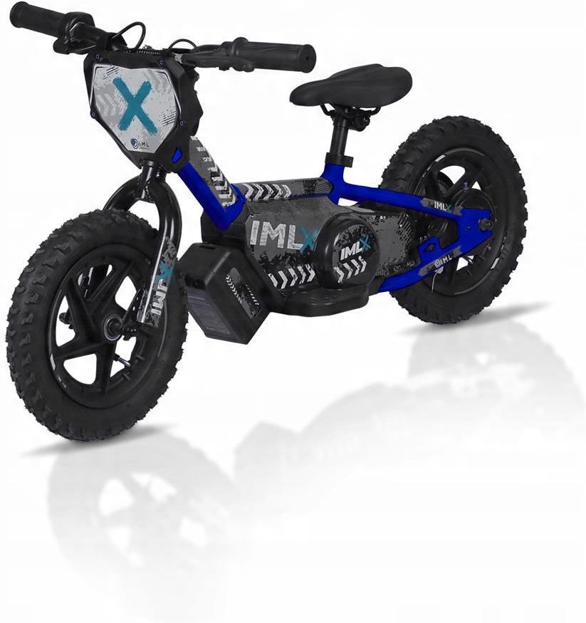 Elektryczny rowerek biegowy IML X 12” Rowerek biegowy IML X 12″ to połączenie sportowej zabawy z elektrycznym wsparciem — idealny pierwszy pojazd dla małego fana motocrossu. Dzięki lekkiej konstrukcji i dwóm trybom jazdy dziecko może rozwijać swoje umiejętności w bezpieczny sposób. Rowerek biegowy IML X 12″ to połączenie sportowej zabawy z elektrycznym wsparciem — idealny pierwszy pojazd dla małego fana motocrossu. Dzięki lekkiej konstrukcji i dwóm trybom jazdy dziecko może rozwijać swoje umiejętności w bezpieczny sposób. Specyfikacja Waga: 9,5 kg Wymiary: 100 × 52 × 56 cm Bateria: Litowo-jonowa Bateria wyciągana: Tak Pojemność Baterii: 24V 5Ah Czas ładowania Baterii: 30 – 60 minut Maksymalny Zasięg *: 15 km Napęd: 200 W Prędkość Max: 20 km/h Masa własna: 9,5 kg Dopuszczalna ładowność: 40 kg Rozmiar Opon (Przód/Tył): 12 cali Wymiary: 1000x520x560 mm * Zasięgi podawane przez producentów są to osiągi maksymalne i w zależności od użytkowania mogą być niższe o około 10-30 %. Na realny zasięg ma wpływ pogoda, teren, prędkość jazdy oraz waga użytkownika. Bezpieczna frajda IML X 12" wyposażony jest w wydajny silnik o mocy 200W, z napędem typu chain. System napędowy zapewnia płynne przyspieszenie, a jednocześnie niski poziom hałasu. Tryby jazdy pozwalają dopasować prędkość do umiejętności dziecka – od 7 do nawet 13 km/h. Napęd działa w sposób progresywny, dzięki czemu dziecko może bezpiecznie nauczyć się manewrowania i kontroli prędkości. Eco moc Model IML X 12" wykorzystuje wyciąganą baterię litową 24V o pojemności 5Ah. Czas jazdy na jednym ładowaniu wynosi od 30 do nawet 60 minut. Bateria jest lekka, odporna na wstrząsy i posiada szybki system ładowania. W zestawie znajduje się dedykowana ładowarka, która zapewnia bezpieczne i wydajne ładowanie.