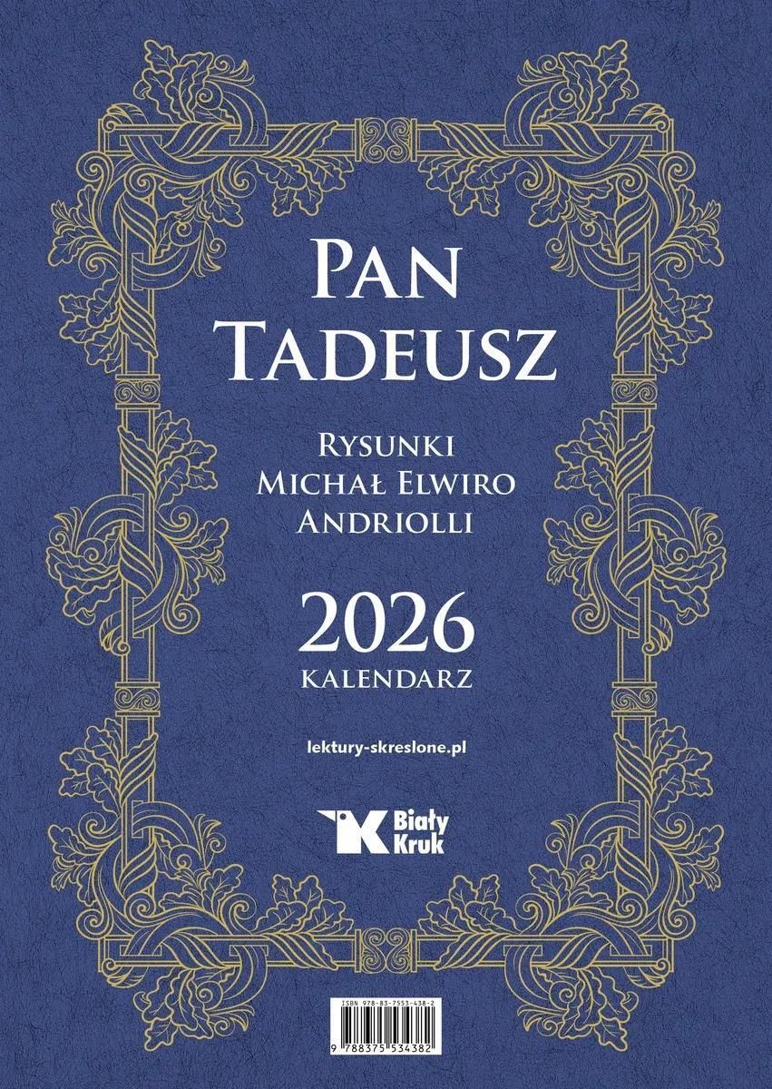 Kalendarz to coś więcej niż tylko kartka z datami – towarzyszy nam każdego dnia. Dlatego warto, żeby był nie tylko praktyczny, ale i piękny. Takie właśnie są eleganckie, estetyczne kalendarze ścienne na 2026 rok przygotowane przez Białego Kruka. Fantastyczne ilustracje, ważne tematy, duży format – będą ozdobą w każdym domu, w każdym miejscu pracy.Wszystkie najważniejsze święta katolickie, uroczystości liturgiczne oraz imieniny zostały wyraźnie zaznaczone.„Pan Tadeusz” to kolejna edycja bestsellerowego kalendarza z rysunkami Michała Elwiro Andriollego do narodowej epopei.Każdy miesiąc to inny obraz, ale i inny cytat z genialnego poematu Adama Mickiewicza, cenzurowanego dzisiaj i rugowanego ze szkół. Warto mieć go na ścianie, by pamiętać, na przekór tym wszystkim, którzy dzisiaj chcą zniszczyć Polskę.Format 305x430 mm, osobna plansza na każdy miesiąc, czytelne kalendarium, elegancki kredowy papier 150 g., lakierowana utwardzana okładka 200 g., mocne tekturowe plecki przez cały format kalendarza, elegancka biała spirala do zawieszenia kalendarza. Kraj produkcji: PL Producent/osoba odpowiedzialna za bezpieczeństwo produktuBiały Kruk sp. z o. o.Szwedzka 3830-324 Krakówbiuro@bialykruk.pl12 260 32 90