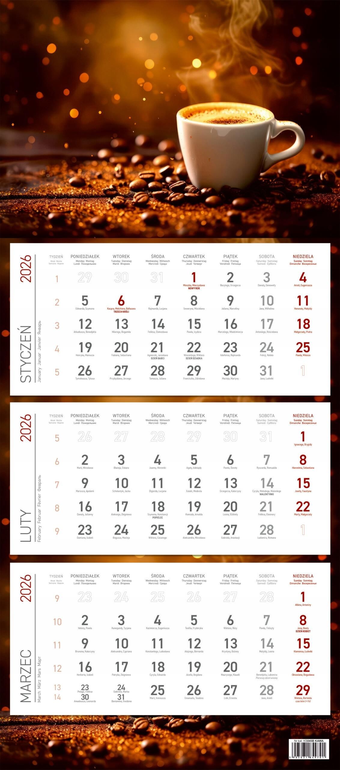 Kalendarz 2026 ścienny trójdzielny, kawa Trzebinia