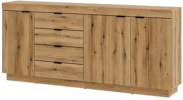 Komodę DELAMAR postaw pod szeroką ścianą. Mebel powiększy optycznie pomieszczenie, jednocześnie oferując wiele miejsca w swoim wnętrzu. Na szerokim blacie pomieścisz ulubione dekoracje oraz akcesoria do pokoju dziennego. Maksymalne obciążenie blatu - 25 kg. Porządek w szufladach i dokumentach Komoda z 4 szufladami W 4 szufladach pomieścisz wiele dokumentów oraz drobnych przedmiotów. Wszystko poukładasz według własnego planu, zachowując porządek na dłużej. Dzięki prowadnicom kulkowym łatwo dostaniesz się do wnętrza szuflady. W środku swobodnie pomieścisz dokumenty o formacie A4. Więcej miejsca w szafkach Komoda do salonu Za otwieranymi frontami znajduje się aż 9 wnęk. Półki posiadają 2 szerokości, dzięki czemu wewnątrz pomieścisz przedmioty o różnych rozmiarach. W środku przechowasz zarówno dekoracje, tekstylia jak i przedmioty do jadalni - zastawę, zestaw sztućców. Masywne meble z delikatnymi wgłębieniami Kolekcja DELAMAR Urządź pokój dzienny w rustykalnym stylu z nutą nowoczesności z kolekcją DELAMAR. Proste i masywne meble w połączeniu z ciepłym odcieniem dębu sprawia, że kolekcja wygląda jakby była wyrzeźbiona z drewna. Meble zostały wykończone laminatem i folią PVC w wybarwieniu dąb evoke. Wyraźne przebarwienia, sęki i słoje przypominają naturalne drewno. Cienkie wgłębienia na części frontów dodają ciekawego akcentu, który wyróżnia meble. Podkreśl je prostymi dodatkami, uwydatniając ozdobny front. Czarne metalowe uchwyty pozwolą na wygodne dostanie się do wnętrza szafek i szuflad. Ciepłe światło wewnątrz witryn włącz wieczorem. Niech delikatnie rozświetli pomieszczenie, tworząc przytulną atmosferę.