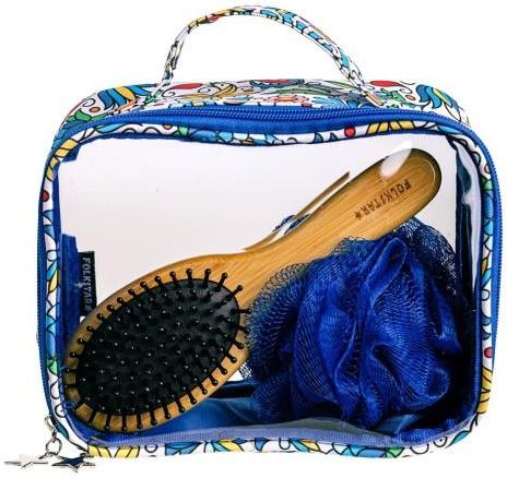 Kosmetyczka podróżna folk - wzory kaszubskie Pojemna kosmetyczka ozdobiona motywem kwiatowym z haftów kaszubskich oraz niebieskim wykończeniem. Kosmetyczka wykonana z polipropylenu, Zamykana na zamek błyskawiczny. Sprzedawana w komplecie z wyposażeniem, w którego skład wchodzą: szczotka do włosów oraz myjka do ciała. Idealna na prezent. Doskonale dopasuje się do torby podróżnej, plecaka czy bagażu. Wymiary: szerokość: 21 cm wysokość: 16 cm głębokość: 10 cm Kolor: niebieski Materiał: 100% polipropylen