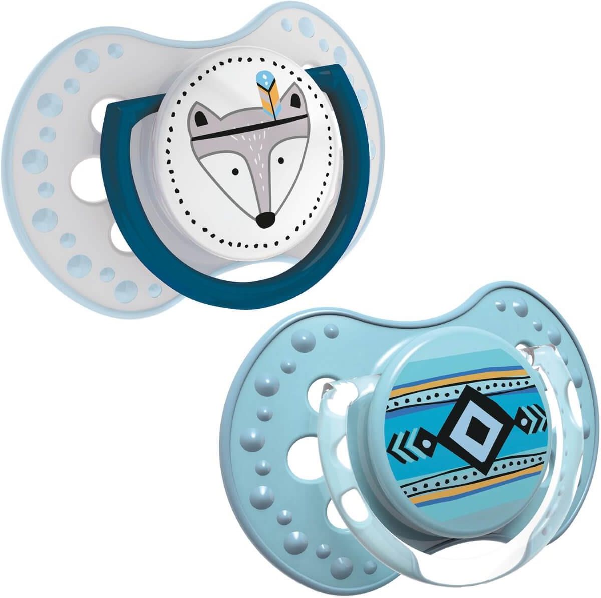 LOVI Smoczek silikonowy dynamiczny 18m+ 2 szt Indian Summer Boy Dynamiczna gumka Zbudowana jest z niejednorodnej warstwy silikonu, dzięki czemu rozciąga się i kurczy zgodnie z rytmem ssania dziecka. Symeryczny kształt gumki jest inspirowany kształtem brodawki sutkowej. Profilowana tarczka …