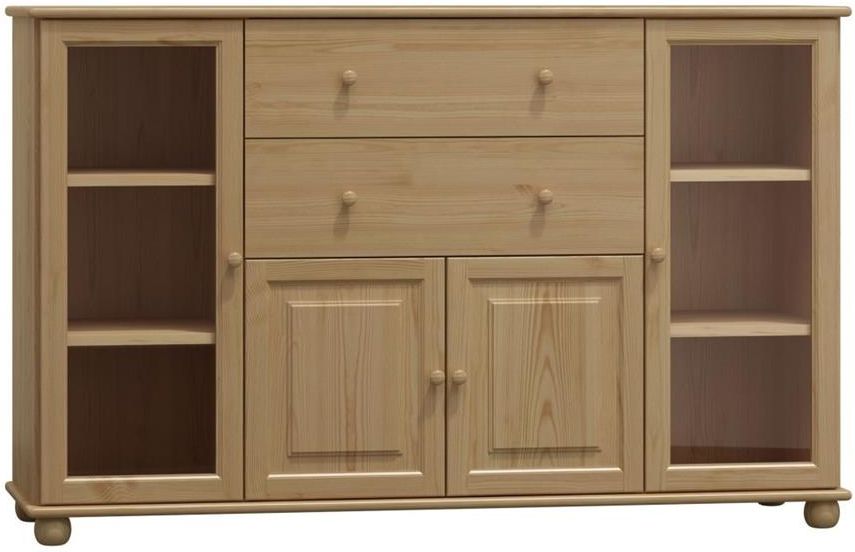 Komoda C63 140X80X47 Wykonana w całości z drewna sosnowego, plecy z płyty pilśniowej. Komoda zawiera: Prowadnice rolkowe 1 pakowną szufladę 2 pakowne półeczki zamykane, za szybą 1 półeczka za zamykanymi drzwiczkami pełnymi Komoda jest lakierowana lakierem bezbarwnym metodą natryskową. Mebel wysyłany w paczce do samodzielnego montażu wraz z instrukcją oraz akcesoriami Wymiary komody : Szerokość 140 cm wysokość 80 cm głębokość 47 cm