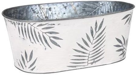 OWALNY SREBRNY METALOWY KOSZYK W LIŚCIE 30x20x12 cm Przeznaczenie: osłonka na gwiazdę betlejemską, osłona na cyprys, metalowy koszyk do pakowania prezentów bożonarodzeniowych, osłonki na stroiki świąteczne, pudełko metalowe na prezent Wymiary koszyka: długość zewnętrzna: 30 cm szerokość zewnętrzna: 20 cm wysokość: 12 cm Cechy produktu: wykonany z metalu kolor: odcienie bieli i srebra kształt owalny delikatnie zwęża się ku dołowi tłoczony motyw - liście