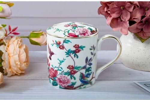 Zestaw kubek w kwiaty z metalowym sitkiem i przykrywką z serii English Collection firmy MARCO POLO. Kubek oraz przykrywka wykonane są z dobrej jakości porcelany. Pojemność kubka 390 ml (pojemność liczona po rant kubka).Stonowana kolorystyka kwiatów oraz ptaszków na białym tle zdobiona złotymi …