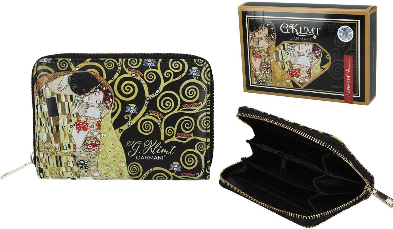 Portfel ozdobiony motywem z obrazu Gustava Klimta - Pocałunek. Duży i dobrze zorganizowany - tak można określić ten portfel. Posiada przegródki na banknoty, karty płatnicze, wizytówki oraz zamykaną kieszonkę na monety. Nowoczesny i praktyczny, idealnie wkomponuje się w każdej damskiej torebce. Kolekcja CARMANI. W naszej ofercie wyłącznie oryginalne produkty marki Carmani - objęte gwarancją producenta. Atesty: ZWO/GP/AT9000 Wzór: pocałunek Produkt 1 x portfel Wymiary długość: 14.5 cm szerokość: 9,5 cm wysokość: 2.7 cm Materiał tworzywo sztuczne