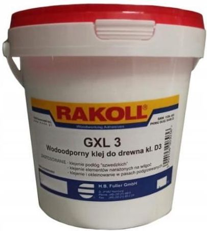 RAKOLL GXL-3 Klej Do Drewna Masa: 10kg Rakoll GXL-3 jest klejem dyspersyjnym winylowym o dobrych parametrach wiązania i wytrzymałości mechanicznej. Wysokiej jakości klej w o wododporności D3 i wszechstronnym zastosowaniu. Klejenie montażowe, blokowe, okleinowanie fornirami oraz laminatami. W połączeniu z utwardzaczem spełnia normę D4. Przygotowanie materialu Elementy winny być dobrze dopasowane, wolne od pyłu i tłustych zanieczyszczeń. Duże tolerancje pasowania mogą wydłużyć czas prasowania i zmniejszyć wytrzymałość mechaniczną spoiny. Nanoszenie kleju Nanosić jednostronnie i równomiernie pędzlem lub urządzeniami nanoszącymi. W wypadku szczególnie wysokich oczekiwań odnośnie wodoodporności nanosić dwustronnie. Prasowanie Klejone elementy połączyć w okresie czasu otwartego i prasować do uzyskania wystarczającej wytrzymałości wstępnej.