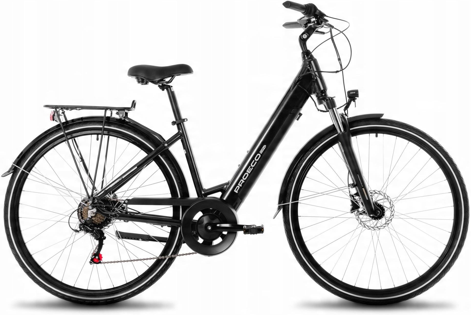 Rower elektryczny PROECO WAVE AN 1.0 26 504Wh grafitowy S – komfortowa jazda po mieście i ścieżkach rowerowych Rower elektryczny PROECO WAVE AN 1.0 26 504Wh grafitowy S to doskonały wybór dla kobiet szukających wygodnego, nowoczesnego i praktycznego środka transportu na co dzień. Niski przekrok ramy typu wave ułatwia wsiadanie i zsiadanie, co docenią szczególnie osoby o niższym wzroście oraz użytkowniczki dojeżdżające w stroju codziennym czy biurowym. Model został dopasowany do osób o wzroście ok. 150–165 cm, dzięki czemu zapewnia stabilną pozycję, łatwe sięganie do kierownicy oraz pełną kontrolę nad rowerem w ruchu miejskim. Rozmiar kół 26 cali gwarantuje zwrotność i pewne prowadzenie, szczególnie przy ruszaniu z sygnalizacji świetlnej, manewrowaniu na ścieżkach rowerowych czy omijaniu przeszkód na drodze. To idealne rozwiązanie dla użytkowniczek poruszających się po zatłoczonych ulicach, parkach i alejkach, gdzie liczy się szybka reakcja i dobra sterowność. Mocny silnik w tylnym kole i baterią 504 Wh – wsparcie w codziennych dojazdach i weekendowych wycieczkach Za napęd w tym modelu odpowiada silnik Ananda M131 umieszczony w tylnej piaście, generujący moment obrotowy 40 Nm. Takie rozwiązanie zapewnia płynne, naturalne przyspieszenie i stabilne prowadzenie, szczególnie podczas ruszania z miejsca oraz podjeżdżania pod wzniesienia. Dzięki napędowi w tylnym kole rower zachowuje dobre wyczucie trakcji, co jest ważne na wilgotnym asfalcie, bruku czy ubitych ścieżkach leśnych. Wydajna, zintegrowana bateria o pojemności 504 Wh pozwala na komfortowe pokonywanie codziennych dystansów – dojazd do pracy, szkoły czy na uczelnię, a także dłuższe weekendowe przejażdżki poza miasto. W praktyce oznacza to możliwość zrealizowania kilku dni dojazdów bez konieczności ładowania, w zależności od wybranego poziomu wspomagania, ukształtowania terenu i stylu jazdy. Zintegrowane umiejscowienie akumulatora poprawia też estetykę roweru i obniża ryzyko jego uszkodzenia podczas codziennego użytkowania i parkowania pod blokiem, w garażu czy pod biurem. Aluminiowa rama i amortyzowany widelec 60 mm – wygoda i stabilność na nierównościach Rama wykonana z lekkiego aluminium to solidna podstawa całej konstrukcji. Ten materiał łączy wytrzymałość z niską masą, co ułatwia prowadzenie, przenoszenie roweru po schodach czy wprowadzanie go do windy. Geometria dostosowana do kobiet oraz niski przekrok sprawiają, że rower jest przyjazny dla początkujących użytkowniczek oraz osób wracających na rower po dłuższej przerwie. Amortyzowany widelec o skoku 60 mm skutecznie tłumi drgania powstające na nierównych chodnikach, kostce brukowej, progach zwalniających i polnych drogach. Dzięki temu nadgarstki i ramiona są mniej zmęczone nawet po dłuższej jeździe. W codziennym użytkowaniu oznacza to większy komfort podczas przejazdów po centrum miasta, osiedlowych uliczkach czy podczas rodzinnych wycieczek na ścieżki wokół jezior i w parkach. Hydrauliczne hamulce tarczowe i opony 26x2.0” – bezpieczeństwo w każdych warunkach pogodowych Zestaw hydraulicznych hamulców tarczowych z tarczami 160 mm z przodu i z tyłu dba o mocne i przewidywalne hamowanie niezależnie od pogody. W porównaniu z hamulcami tradycyjnymi, układ hydrauliczny zapewnia lepszą modulację siły hamowania oraz krótszą drogę zatrzymania, co jest szczególnie ważne przy nagłym hamowaniu przed przejściem dla pieszych, na zjeździe czy w ruchu ulicznym. Szerokie opony Wanda 26x2.0” gwarantują dobrą przyczepność na asfalcie, kostce, utwardzonych ścieżkach i lekkim szutrze. Szerszy bieżnik stabilizuje jazdę, poprawia komfort i pomaga utrzymać kontrolę nad rowerem na mokrej nawierzchni lub w piasku. Sprawdzą się zarówno podczas codziennych dojazdów po mieście, jak i podczas rekreacyjnych wyjazdów na działkę, nad rzekę czy do lasu. Napęd 1x7 z komponentami Shimano – prosta obsługa i niezawodność na co dzień Rower został wyposażony w prosty i praktyczny napęd 1 x 7, oparty na komponentach renomowanej marki Shimano. Z tyłu zastosowano przerzutkę Shimano Tourney TY300 oraz wolnobieg Shimano MF-TZ500 14–34T, co zapewnia odpowiedni zakres przełożeń do jazdy po mieście oraz łagodnych podjazdach. Taki zestaw ułatwia dopasowanie biegu do aktualnych warunków – od spokojnej jazdy po płaskim, po wsparcie na wzniesieniach. Manetka Shimano ST-EF515 umożliwia płynną i intuicyjną zmianę biegów jednym ruchem dłoni, bez odrywania uwagi od drogi. To praktyczne rozwiązanie dla osób, które wykorzystują rower elektryczny do codziennych dojazdów, wizyt w sklepie, odbioru dzieci z zajęć dodatkowych czy popołudniowych przejażdżek rekreacyjnych. Ergonomiczna pozycja i wygodne wyposażenie – komfort dla kobiet o wzroście 150–165 cm Model PROECO WAVE AN 1.0 został dopasowany do użytkowniczek o wzroście od 150 do 165 cm (rozmiar S, 16 cali). Krótsza rama i odpowiednio dobrany mostek kierownicy (aluminiowy, 90 mm / 25,4 mm) pozwalają utrzymać wyprostowaną, komfortową pozycję, która odciąża plecy, szyję i nadgarstki. To szczególnie ważne przy dłuższych przejazdach po mieście, gdy spędzasz w siodle kilkadziesiąt minut dziennie. Stalowa kierownica o szerokości 610 mm zapewnia pewny chwyt i dobre panowanie nad rowerem podczas manewrowania w wąskich przestrzeniach, np. na parkingach rowerowych, między samochodami lub na zatłoczonych ścieżkach. Wygodne siodło Vader 862 zostało zaprojektowane z myślą o rekreacyjnej, bardziej wyprostowanej pozycji jazdy, dzięki czemu minimalizuje dyskomfort nawet przy dłuższych trasach – np. weekendowych wypadach za miasto czy całodziennym zwiedzaniu okolicy na rowerze. Zintegrowane oświetlenie LED i jednostka sterująca Ananda – kontrola nad rowerem i dobra widoczność Przednia i tylna lampa LED zwiększają bezpieczeństwo podczas poru