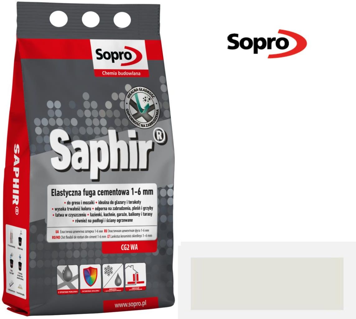 Saphir® - Elastyczna fuga cementowa 1 – 6 mm SOPRO SAPHIR FUGA 16 JASNY SZARY 2kg Cementowa zaprawa fugowa do spoinowania okładzin ceramicznych. Do spoin o szerokości od 1 do 6 mm Szczególnie do chłonnych okładzin ceramicznych Wysoka ochrona przed rozwojem pleśni i mikroorganizmów dzięki …