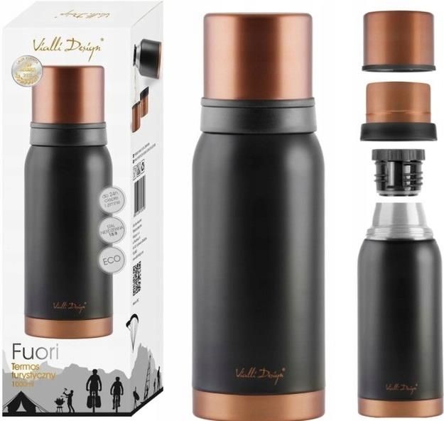Cechy - Termos do Herbaty 1 L: posiada 1 litr pojemności Termos do herbaty 1 L jest w 100% szczelny wyróżnia go wyjątkowy, czarny kolor Posiada dwa kubki o pojemności 150ml i 200ml wyposażony w stalową izolację próżniową, która zapewnia maksymalne utrzymanie temperatury dla gorących i zimnych napojów nawet do 24 godzin wykonany z higienicznej i solidnej stali nierdzewnej (18/8) wysokiej jakości oraz tworzywa sztucznego jest niezwykle lekki i kompaktowy, stąd jego transport, czy przenoszenie jest komfortowe i proste zewnętrzna część termosu nie nagrzewa się, ani nie skrapla, co zdecydowanie pozwala uniknąć niechcianych poparzeń i innych nieprzyjemności wyróżnia się stylowym wyglądem dostępnym w wielu wariantach kolorystycznych doskonale sprawdza się podczas dalekich wycieczek górskich, wypraw narciarskich, czy też w podróży Termos do Herbaty 1 LPoszukujesz praktycznego ale i zarazem stylowego termosu, który doskonale posłuży Ci podczas dalekich wspinaczek górskich, wypraw narciarskich, czy też podróży? Jeśli tak - trafiłeś/aś doskonale! Uznana polska marka Vialli Design zaprojektowała wyjątkowe termosy turystyczne serii Fuori. Wśród nich jest również termos do herbaty 1 L!Przemyślana konstrukcja termosuKompaktowy rozmiar i niewielka waga sprawiają, że transport termosu nie jest żadnym problemem – można z łatwością zabierać go nawet do pracy. Wbrew pozorom, termos do herbaty 1 L zachwyca także swoją poręcznością, bowiem trzymanie go w dłoni jest wygodne i nie powoduje potencjalnego wyślizgiwania się. Termos do herbaty 1 L został zaprojektowany w ten sposób, aby jego użytkowanie było jak najbardziej proste i przyjemne. Dzięki odpowiednim uszczelkom i specjalnej nakrętce, termos na herbatę jest w 100% szczelny, co zapewnia bezpieczeństwo wszędzie, gdzie go przenosimy i o każdej porze. Co więcej, termos został wyposażony w specjalną izolację próżniową wewnątrz, która gwarantuje utrzymywanie odpowiedniej temperatury napojów (nawet do 24 godzin!).Stylowy wygląd termosuTermos do herbaty 1 L od Vialli Design został zaprojektowany w wyjątkowym stylu. Połączenie przyjemnej subtelności z modnym minimalizmem wprowadza w niepowtarzalny klimat, dzięki czemu użytkowanie termosu staje się jeszcze bardziej przyjemne. Ze względu na dostępność termosu w szerokiej gamie kolorystycznej, każdy z pewnością odnajdzie ten, który najbardziej trafia w jego indywidualny gust. Zobacz też: termos zielony i termos granatowy.Dlaczego warto wybrać Termos do Herbaty 1 L?Termos do herbaty 1 L zdecydowanie warto wybrać, przede wszystkim ze względu na jego niezwykłą praktyczność. Jest w 100% szczelny, bezpieczny w użytkowaniu i nie zaskoczy nas żadnymi nieprzyjemnymi niespodziankami w trakcie transportu. Składa się z dwóch kubków o pojemności 150 ml i 200 ml. Utrzymuje odpowiednią temperaturę gorących i zimnych napojów aż do 24 godzin. Ponadto, posiadając już termos do herbaty 1 L czarny, z pewnością zechcesz pochwalić się jego stylowym wyglądem wśród innych dookoła! Vialli Design - sprawdzona polska markaVialli Design to stosunkowo młoda polska marka - założona w 2010 roku we współpracy z włoskimi producentami, która oferuje szeroki wybór starannie zaprojektowanych akcesoriów kuchennych. Wśród nich znajdują się m. in.: szklanki, termosy, filiżanki, zaparzacze, pojemniki, sztućce, noże oraz młynki. Firma Vialli Design niejednokrotnie została nagrodzona, np. ’Laurem Konsumenta’, ‘Polska Jakość’ czy też ‘Grand Prix 2016’. Czas utrzymania temperatury 86400 sIzolacja próżniowa stalowaKolekcja FuoriKolor czarnyMateriał stal nierdzewna Tworzywo sztucznePojemność 1 lPojemność kubka 1 150 mlPojemność kubka 2 200 mlSzczelny TakSzerokość 98 mmTyp stali 18/8Wysokość 29,5 cm