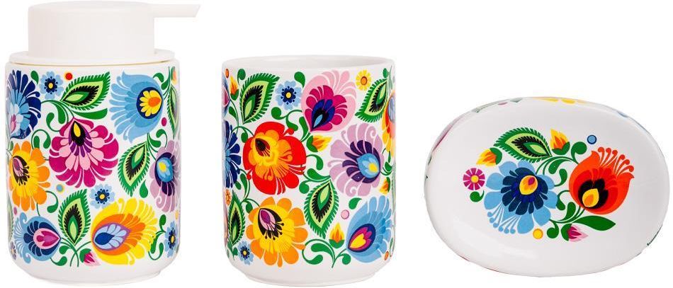 Zestaw łazienkowy - łowicki biały Przenieś odrobinę folkloru do swojej łazienki! Nasz zestaw łazienkowy w stylu łowickim to trio idealne: dozownik na mydło, mydelniczka i kubeczek na szczotkę, które nie tylko dbają o porządek, ale też dodają wnętrzu charakteru. Każdy element zdobi kolorowy wzór łowicki - poprawa humoru przy porannej toalecie gwarantowana! Niech Twoja łazienka przestanie być nudna. Z Folkstar codzienna rutyna staje się zabawą. ;) Idealny prezent dla miłośników folkloru i tych, którzy lubią wprowadzać do domu trochę humoru i koloru. ozdobiony wzorem łowickim zestaw zawiera dozownik na mydło, mydelniczkę i kubek na szczoteczki ozdobi wnętrze łazienki pasuje do każdej łazienki przyciąga wzrok idealny na prezent Wzór: łowicki Zestaw zawiera: dozownik na mydło, mydelniczkę, kubek na szczoteczki Wymiary: dozownik na mydło: 13 x 8,5 cm, mydelniczka: 11,3 x 8 x 2,5 cm, kubek na szczoteczki: 10 x 8,5 cm Wykonane z ceramiki Pojemność dozownika i kubka: 350 ml