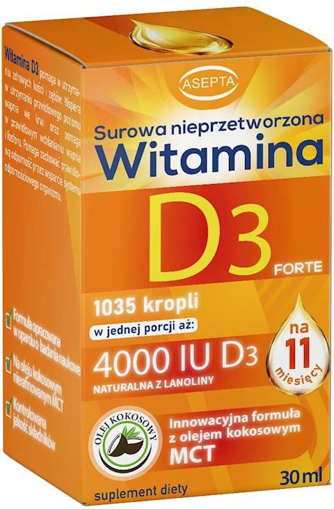WITAMINA D3 Forte 30ML z Olejem Kokosowym MCT 4000 IU Naturalna z Lanoliny Witamina D3 firmy Asepta to suplement diety w formie olejku o wysokiej dawce witamin w bardzo korzystnej cenie. Nasza witamina szczyci się wysoką dawką i niezwykłą wydajnością, która przekłada się na niski koszt codziennego stosowania, nie tracąc przy tym jakości. 🤔 Dla Kogo Witamina D3 🤔 Produkt przeznaczony jest dla osób szukających skutecznej, a zarazem taniej suplementacji witamin odpowiedzialnych za wsparcie prawidłowej odporności. Witamina D3 wspiera Układ odpornościowy Zdrowie kości i zębów Zdrowie serca i układu krążenia Zdrowie mięśni Regulacje poziomu wapnia w krwi 🌿 Wspaniałe Składniki 🌿 👉🏻 Witamina D3 Witamina D jest zaliczana do grupy witamin, choć naturalnie wytwarzana jest w skórze pod wpływem promieni UV ze słońca. W okresie jesienno-zimowym, gdy naturalne nasłonecznienie jest ograniczone, istnieje ryzyko niedoboru tej witaminy. Badania przekrojowe wykazały, że u 90% zdrowych dorosłych kobiet i mężczyzn występują niedobory witaminy D, czyli stężenie 25-hydroksyprowitaminy D (25(OH)D) poniżej 30 ng/ml (Marcinkowska i wsp. 2018, Płudowski i wsp. 2016). Suplement diety w postaci kropli zawierający witaminę D3, K2 Mk7 stanowi uzupełnienie diety o wymienione składniki odżywcze. Regularne spożywanie suplementów z witaminą D pomaga w utrzymaniu zdrowych kości i zębów. Wspiera w utrzymaniu prawidłowego poziomu wapnia we krwi oraz pomaga w prawidłowym wchłanianiu wapnia i fosforu. Pomaga także zachować prawidłową odporność przez wsparcie systemu odpornościowego. 🌿 Charakterystyka 🌿 Składniki / Ingredients: olej MCT zawierający średniołańcuchowe kwasy tłuszczowe z orzechów kokosowych, cholekalcyferol (witamina D), przeciwutleniacz: octan DL-alfatokoferylu. Produkt może zawierać soję. Zalecana porcja dzienna: 3 krople w ciągu dnia. Porcję dzienną należy rozcieńczyć w soku, mleku, wodzie lub jogurcie. Nie spożywać produktu bezpośrednio. Ostrzeżenia: nie należy przekraczać zalecanej porcji do spożycia w ciągu dnia. Suplementy diety nie mogą być stosowane jako substytut (zamiennik) zróżnicowanej diety. Zrównoważony sposób żywienia oraz prowadzenie zdrowego trybu życia są ważne dla prawidłowego funkcjonowania organizmu. Nie stosować w przypadku nadwrażliwości na składniki produktu. Suplement diety przeznaczony dla zdrowych, dorosłych osób powyżej 75. roku życia. Nie zaleca się stosowania kobietom w ciąży, karmiącym oraz osobom poniżej 18. roku życia. Przed zastosowaniem wskazane jest wykonanie badania 25-(OH)D we krwi oraz konsultacja wyniku badania z lekarzem lub farmaceutą. Przechowywanie: przechowywać w oryginalnym, zamkniętym opakowaniu, w temperaturze pokojowej. Chronić przed bezpośrednim działaniem promieni słonecznych oraz wilgocią. Suplement diety powinien być przechowywany w sposób niedostępny dla małych dzieci.