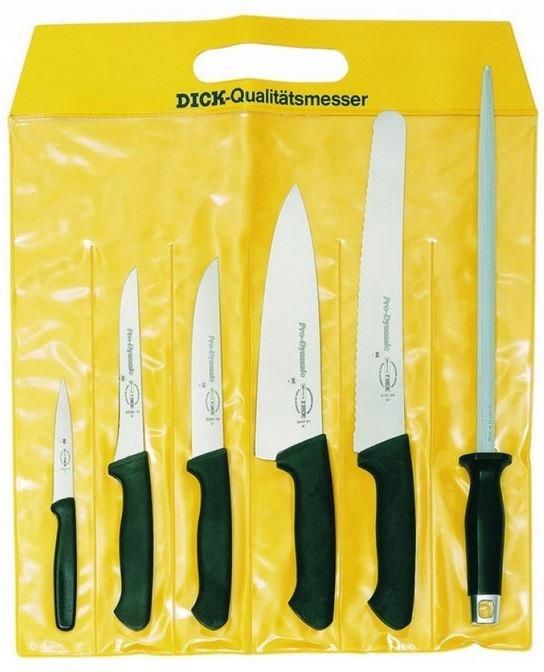 Zestaw pięciu noży kuchennych z ostrzałką DICK Pro Dynamic No 8510000 – czarny kolor rękojeści Zestaw pięciu noży kuchennych z ostrzałką DICK Pro Dynamic No 8510000 – czarny kolor rękojeści. Sześcioczęściowy zestaw: pięciu sztuk noży kuchennych wraz z jedną ostrzałką z najpopularniejszymi nożami do profesjonalnej kuchni. Zestaw zawiera 1 sztuka - krótki nóż kuchenny DICK 8262011 z czarną rękojeścią (długość ostrza 11 cm) 1 sztuka twardy nóż do trybowania DICK 8 536815 z czarną rękojeścią (długość ostrza 15 cm) 1 sztuka klasyczny nóż kuchenny DICK 8 508016 z czarną rękojeścią (długość ostrza 16 cm) 1 sztuka nóż uniwersalny z ząbkowanym ostrzem DICK 8515126 z czarną rękojeścią (długość ostrza 26 cm) 1 sztuka twardy nóż szefa kuchni DICK 8544721 z czarną rękojeścią (długość ostrza 21 cm) 1 sztuka ostrzałka, stalka kuchenna DICK 7654130 szlif standardowy z czarną rękojeścią (długość ostrza 30 cm) Seria Pro Dynamic to higieniczne noże kuchenne do użytku profesjonalnego - bezkompromisowe pod względem ergonomii i ostrości. Noże DICK to również ergonomiczne, wygodne uchwyty, o antypoślizgowej powierzchni rękojeści i to zarówno w stanie mokrym, jak i tłustym. Łatwa w utrzymaniu higiena, ponieważ nóż nie ma szczeliny na wylocie ostrza. Dodatkowo szeroka ochrona palców zapewnia większe bezpieczeństwo podczas pracy. Nagrodzony amerykańskim znakiem higieny i jakości NSF. Ostrze X55CrMo14, antypoślizgowa plastikowa rękojeść. Zrównoważona twardość 56° HRC to idealny kompromis dla idealnego trzymania krawędzi i łatwego ponownego ostrzenia.
