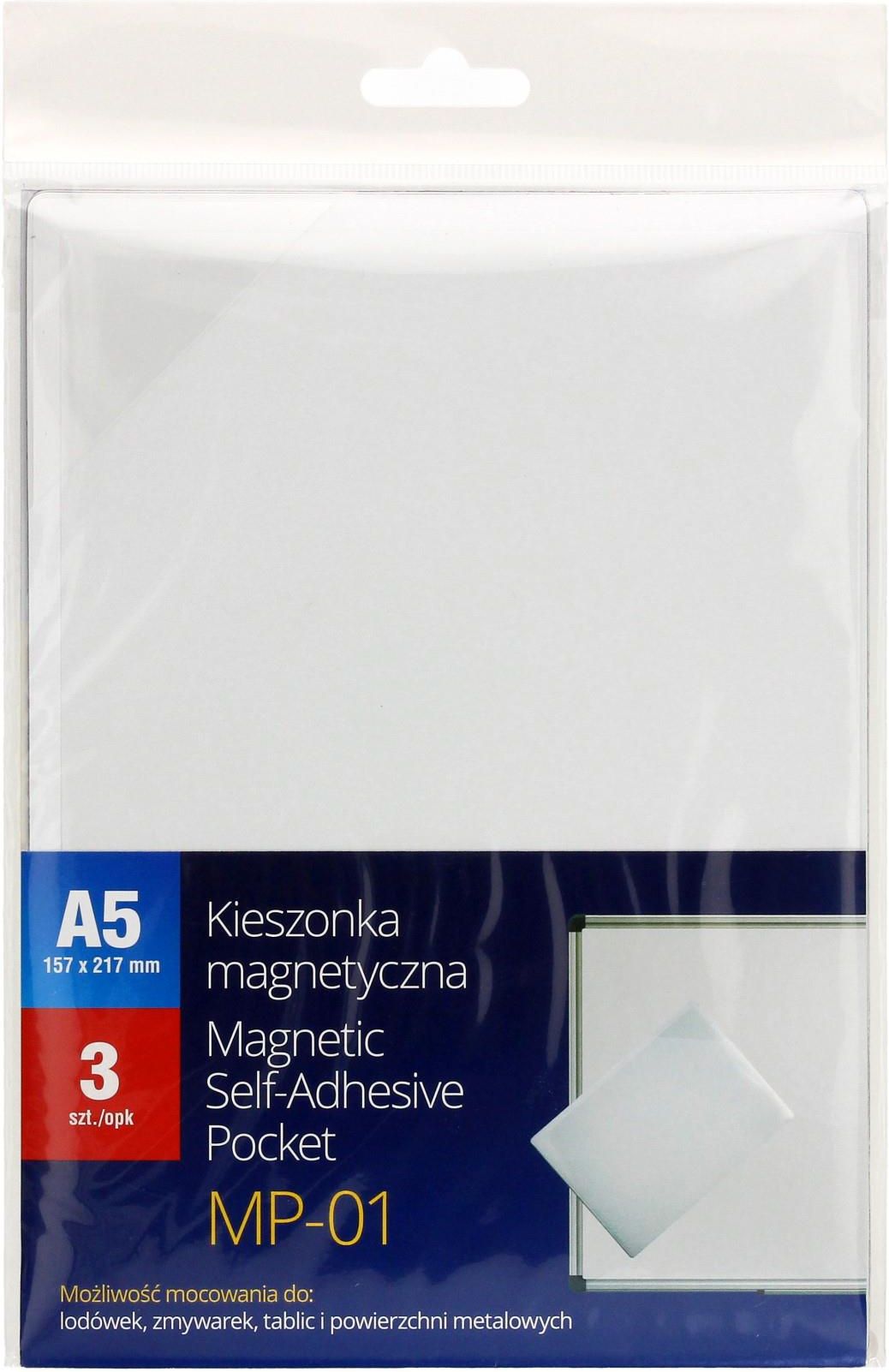 Kieszonki w formacie A5 możliwość wielokrotnego przyczepienia do lodówek, zmywarek, tablic i powierzchni metalowych łatwa i szybka wymiana dokumentów budowa warstwowa: spód – powierzchnia magnetyczna, pokrywa całą kieszonkę, dzięki czemu nie odkleja się od powierzchni, nie pozostawia śladów wierzch – przezroczysta folia z zakładką w rogu kieszonki opakowanie 3 sztuki wymiary: 157×217 mm
