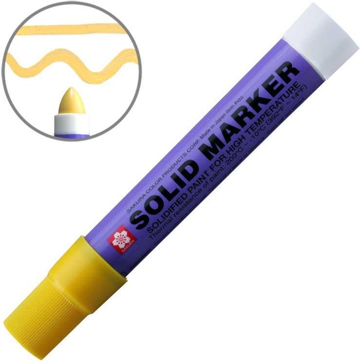 Solid marker - żółty Niezwykle wytrzymały marker do wymagających zadań! Solid Marker to pierwsza na świecie farba w formie stałej w markerze. Zawsze działa, gdziekolwiek i kiedykolwiek! Innowacyjny mechanizm skrętu “stay fresh” utrzymuje farbę świeżą i gotową do użycia. Jeśli marker wyschnie, wystarczy go trochę przyciąć nożem. Końcówkę można też przyciąć, jeśli potrzebne jest mniejsze znakowanie. Właściwości Działa na wielu powierzchniach, szorstkich i gładkich (także pokrytych kurzem i rdzą), również pod wodą. Idealny do stosowania na drewnie, tkaninach i płótnie, plastiku, stali i żelazie, gumie, tekturze, szkle, włóknie szklanym i betonie. Stosowany w budownictwie, spawalnictwie i produkcji, wiertnictwie i rurociągach, liniach montażowych, na oponach samochodowych i szybach, branży HVAC (Heating Ventilation Air Conditioning) i systemach hydraulicznych. Wysycha w ciągu kilku minut, jest trwały po wyschnięciu i praktycznie bezwonny. Usuwalny z nieporowatych powierzchni za pomocą alkoholu lub rozcieńczalnika do lakieru. Etykieta bezpieczeństwa CLP UE: OSTRZEŻENIE: Powoduje podrażnienie skóry. Powoduje poważne podrażnienie oczu. Specyfikacje Temperatura pracy: -10 °C -200 °C Rodzaj atramentu: pigmentowany atrament rozpuszczalnikowy Średnica: 12 mm Rozmiar: 135 mm Przechowywać w pozycji poziomej (leżącej) Sakura to jedna z najstarszych firm produkujących materiały do znakowania w Japonii. Kładzie duży nacisk na innowacyjność. Jako pierwsza na świecie opatentowała tusz pigmentowy na bazie wody, który można było wykorzystać w cienkopisach. W 1978 roku zaprezentowała pionierski marker przemysłowy z farbą w formie stałej „Solid Marker”, który stał się wzorem dla całej kategorii tego typu markerów. „Solid Marker” to pierwszy na świecie marker z farbą w postaci stałej, który zawsze działa, gdziekolwiek i kiedykolwiek chcesz, nawet pod wodą! Ty i Twoi klienci możecie polegać na najwyższej jakości markerach przemysłowych SAKURA. Dzięki badaniom, nieustannemu rozwojowi i wsłuchiwaniu się w opinie użytkowników, SAKURA jest liderem na rynku. Zaopatruje wiodące organizacje na całym świecie z branż: budownictwa, budownictwa drogowego czy stoczniowego, a także branży stolarskiej, drzewnej, stalowej, chemicznej, lotniczej i motoryzacyjnej.