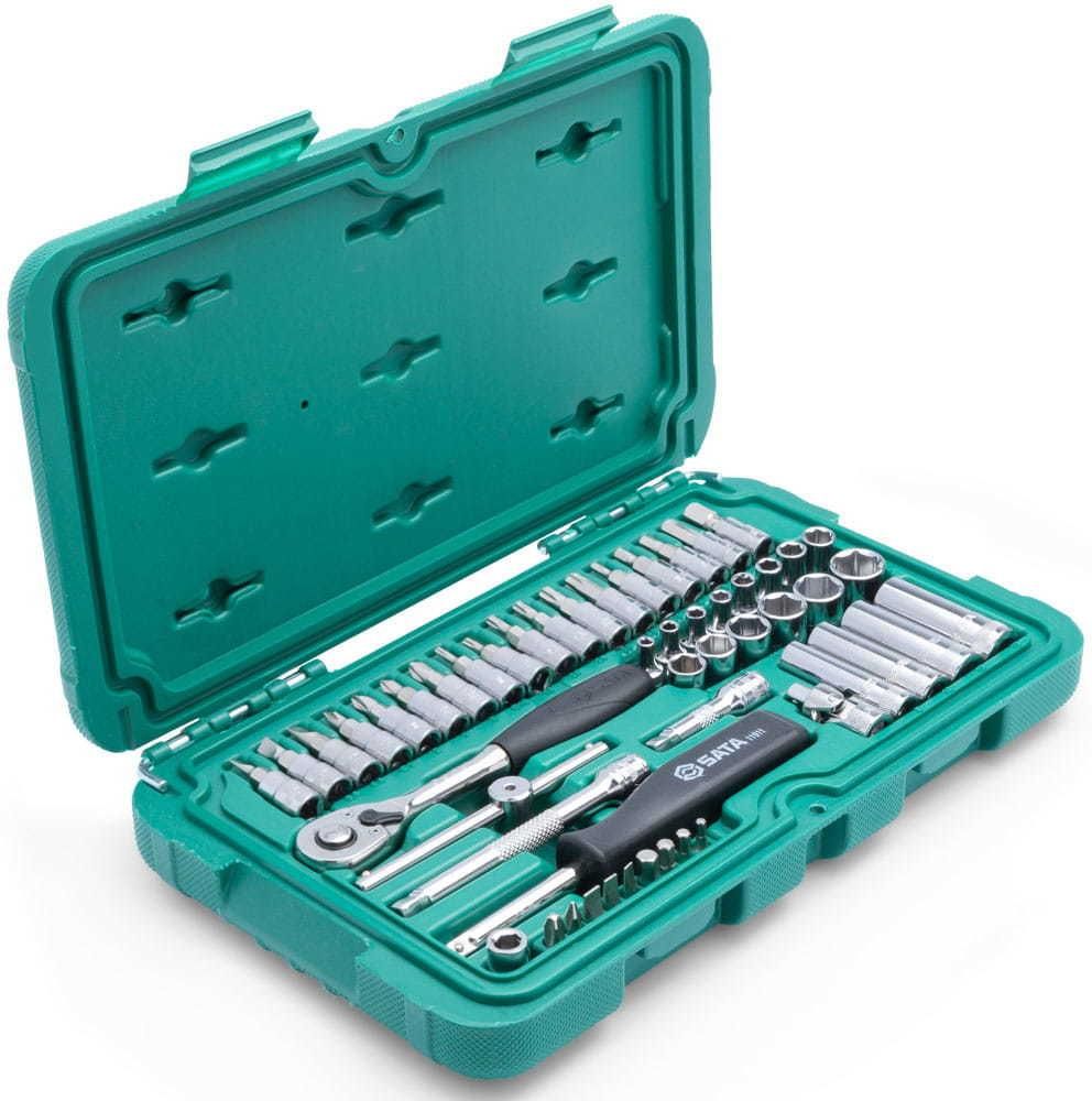 Opis produktu: Klucze nasadowe 1/4" Sata zestaw 52 części. Zawiera nasadki 3,5 - 14 mm, klucze trzpieniowe oraz akcesoria w standardzie napędu 1/4". Polecany do profesjonalnego użytku w serwisie mechanicznym. Narzędzia SATA charakteryzującą się wysoką jakością wykonania i zastosowanych materiałów za atrakcyjną cenę. SATA jako jedna z pierwszych w tej branży udzieliła DOŻYWOTNIEJ GWARANCJI na swoje narzędzia ręczne, co niewątpliwie świadczy o wysokiej jakości i trwałości narzędzi. Wyposażenie standardowe: 14 sztuk nasadek 6-kątnych 1/4": 3.5, 4, 4.5, 5, 5.5, 6, 7, 8, 9, 10, 11, 12, 13, 14 mm 18 sztuk kluczy trzpieniowych (bitów) 1/4": - płaskie: 4.0, 5.5, 6.5mm; - krzyżowe Phillips: PH1, PH2 - krzyżowe pozidriv: PZ1, PZ2 - TORX: T10, T15, T20, T25, T30, T40 - HEX (sześciokątne): 3, 4, 5, 6, 8 mm 9 sztuk końcówki wkrętakowe: - płaskie: 4.0, 5.0, 6.5 mm - krzyżowe Phillips: PH1, PH2 - HEX (sześciokątne): 3, 4, 5, 6 mm 14 szt. Nasadek 6-kątnych 1/4": 3.5, 4, 4.5, 5, 5.5, 6, 7, 8, 9, 10, 11, 12, 13, 14 mm 4 szt. Nasadek 6-kqtnych długich 8, 10, 12, 13 mm Profesjonalna grzechotka szybkomocująca 1/4" Rękojeść wkrętakowa 1/4" Rękojeść przesuwna - pokrętka typu T 1/4" Przedłużki 1/4": 2" (50 mm) oraz 4" (100 mm) Przegub Cardana uniwersalny 1/4"