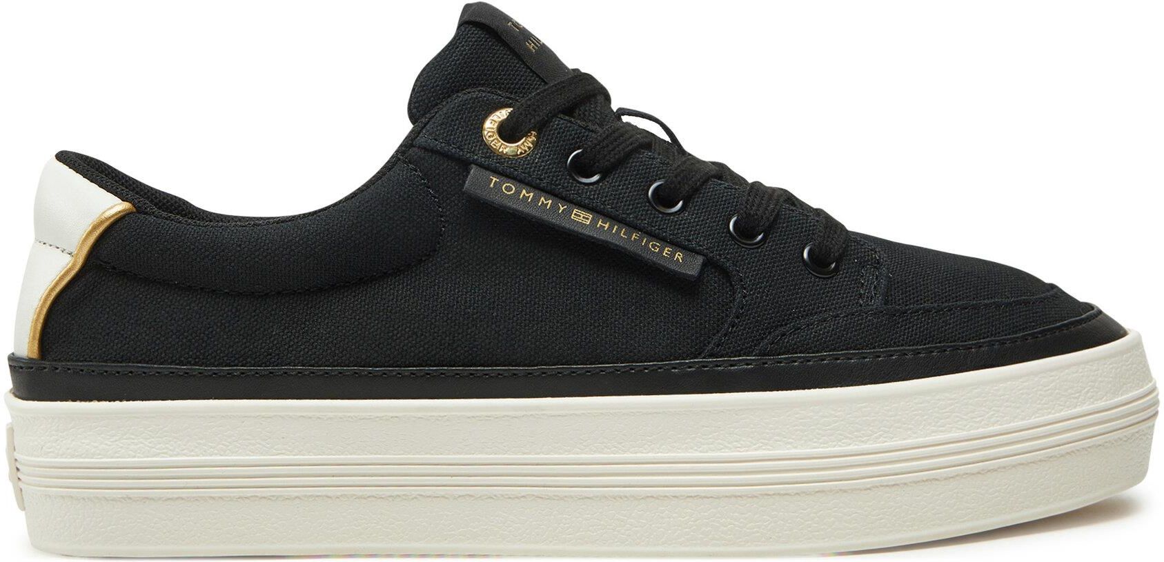Czarne sneakersy damskie Tommy Hilfiger to kwintesencja ponadczasowego stylu i komfortu. Wykonane z materiału włókienniczego, idealnie dopasowują się do stopy, zapewniając wygodę przez cały dzień. Dzięki okrągłemu noskowi oferują swobodę ruchu palcom, co sprawia, że są doskonałym wyborem zarówno na co dzień, jak i na bardziej aktywne chwile. Uniwersalny czarny kolor sprawia, że łatwo dopasujesz je do wielu stylizacji, podkreślając swój wyjątkowy look. Postaw na jakość i styl, jakie gwarantuje marka Tommy Hilfiger!