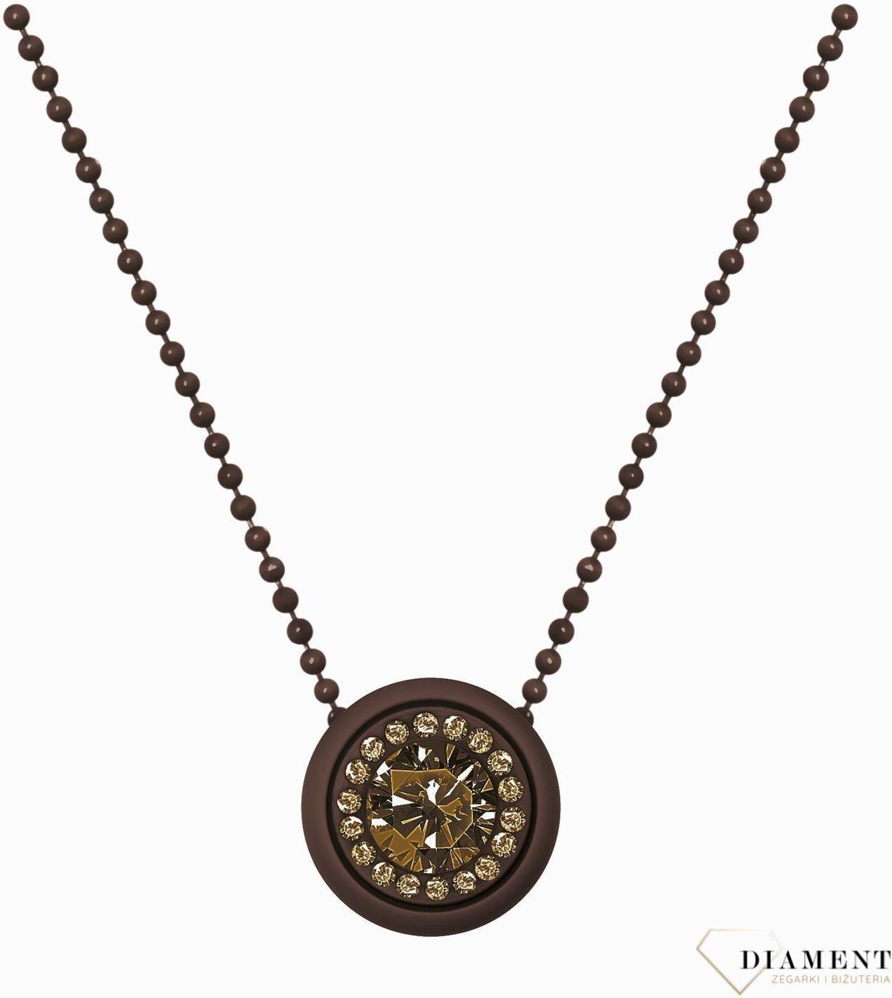 Naszyjnik OPS GEM OPSPL-07-1200 wykonany z metalu, który został pokryty tworzywem w kolorze brązowy. Naszyjnik z zawieszką w kształcie koła, wykonany z silikonu w kolorze pasującym do całości. Zawieszka w kształcie koła została ozdobiona kryształem Swarovskiego w kolorze brązowym, dookoła której …